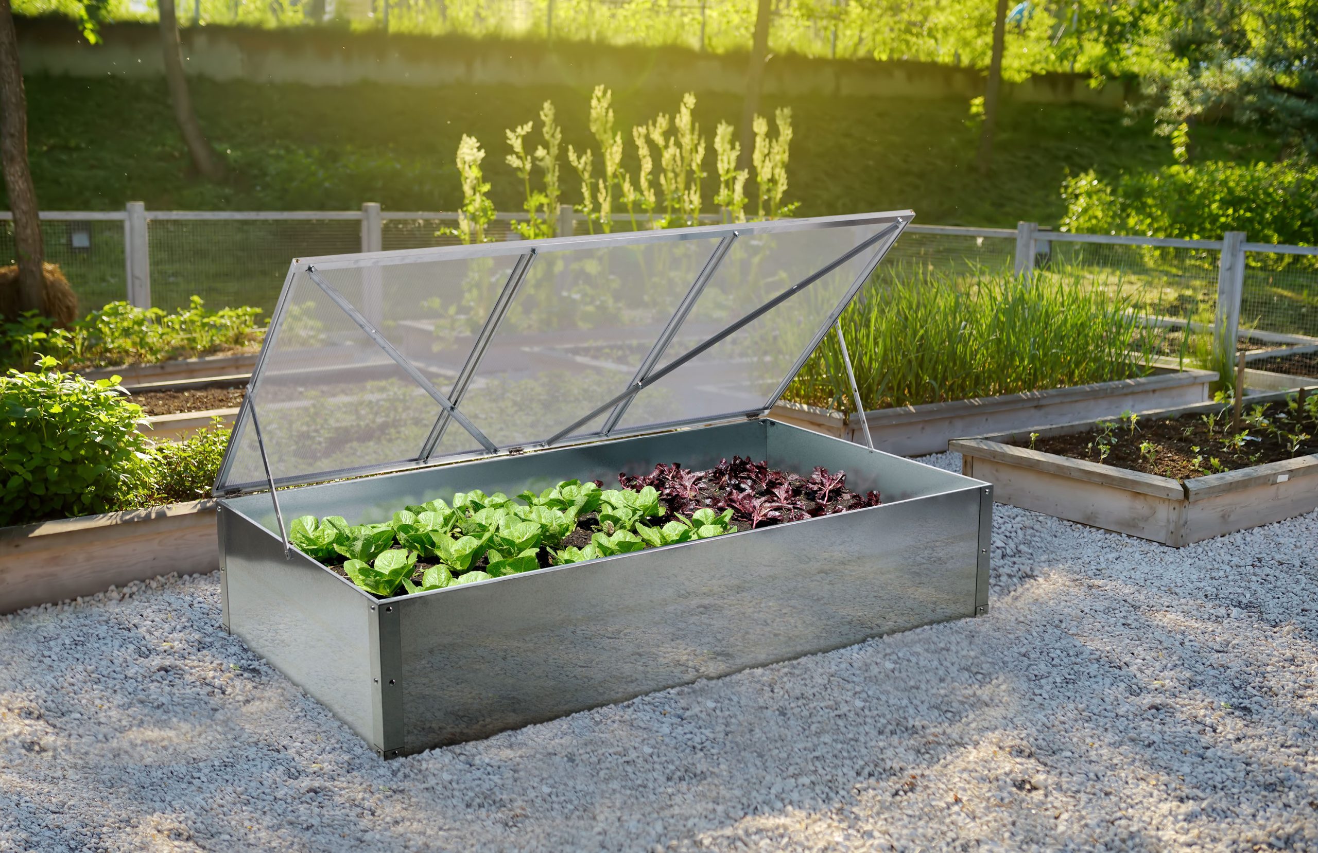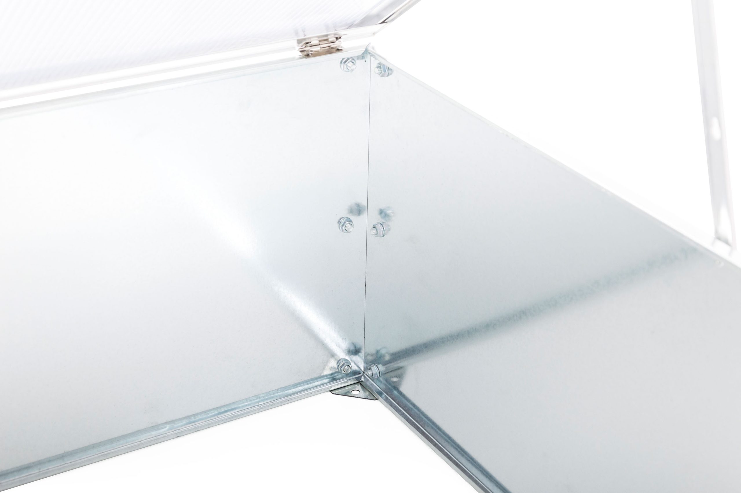 A felső alumíniumkeret  4 mm-es polikarbonát töltelékkelkényelmes hozzáférést biztosít az ültetéshez és a már elültetettnövények gondozásához.