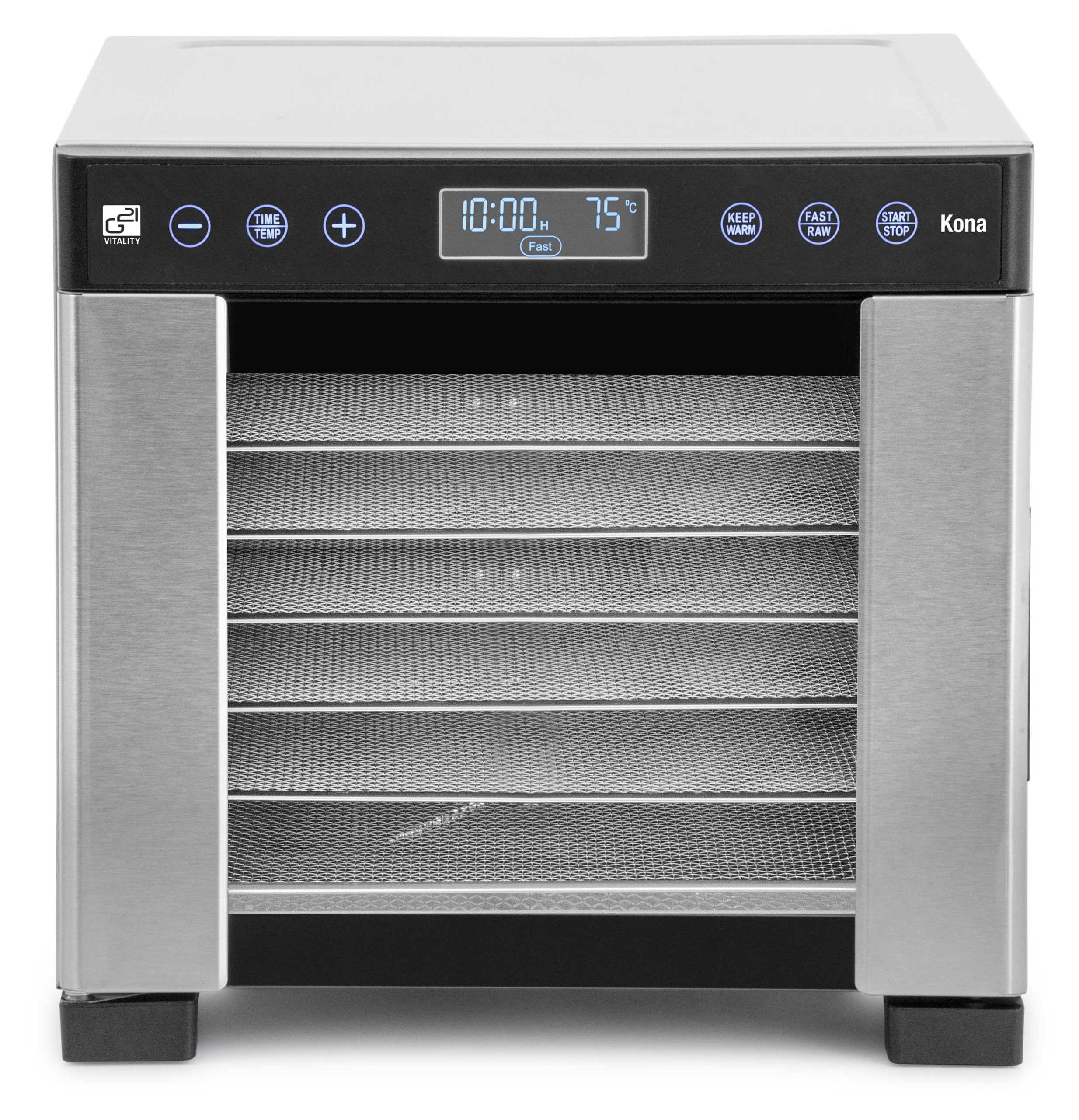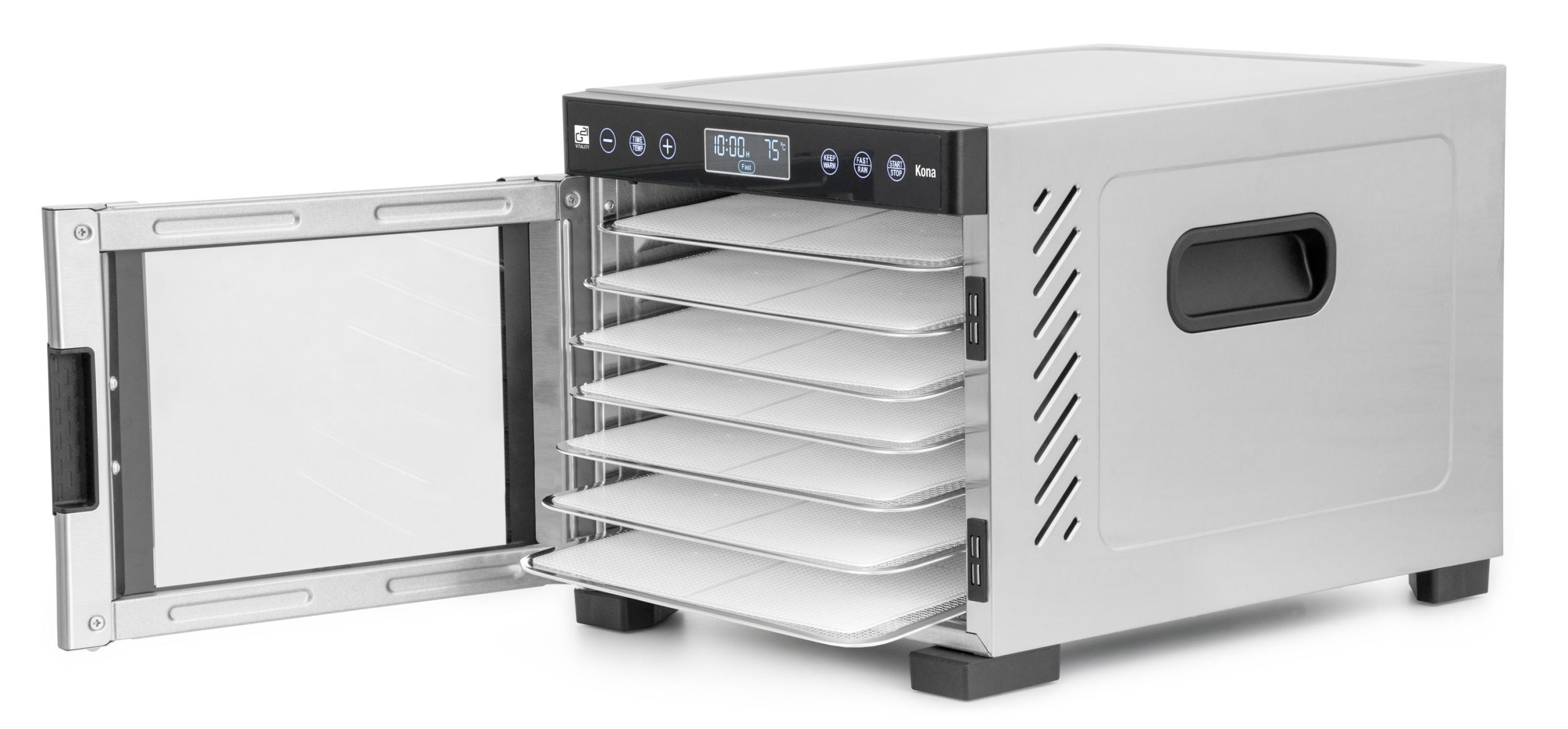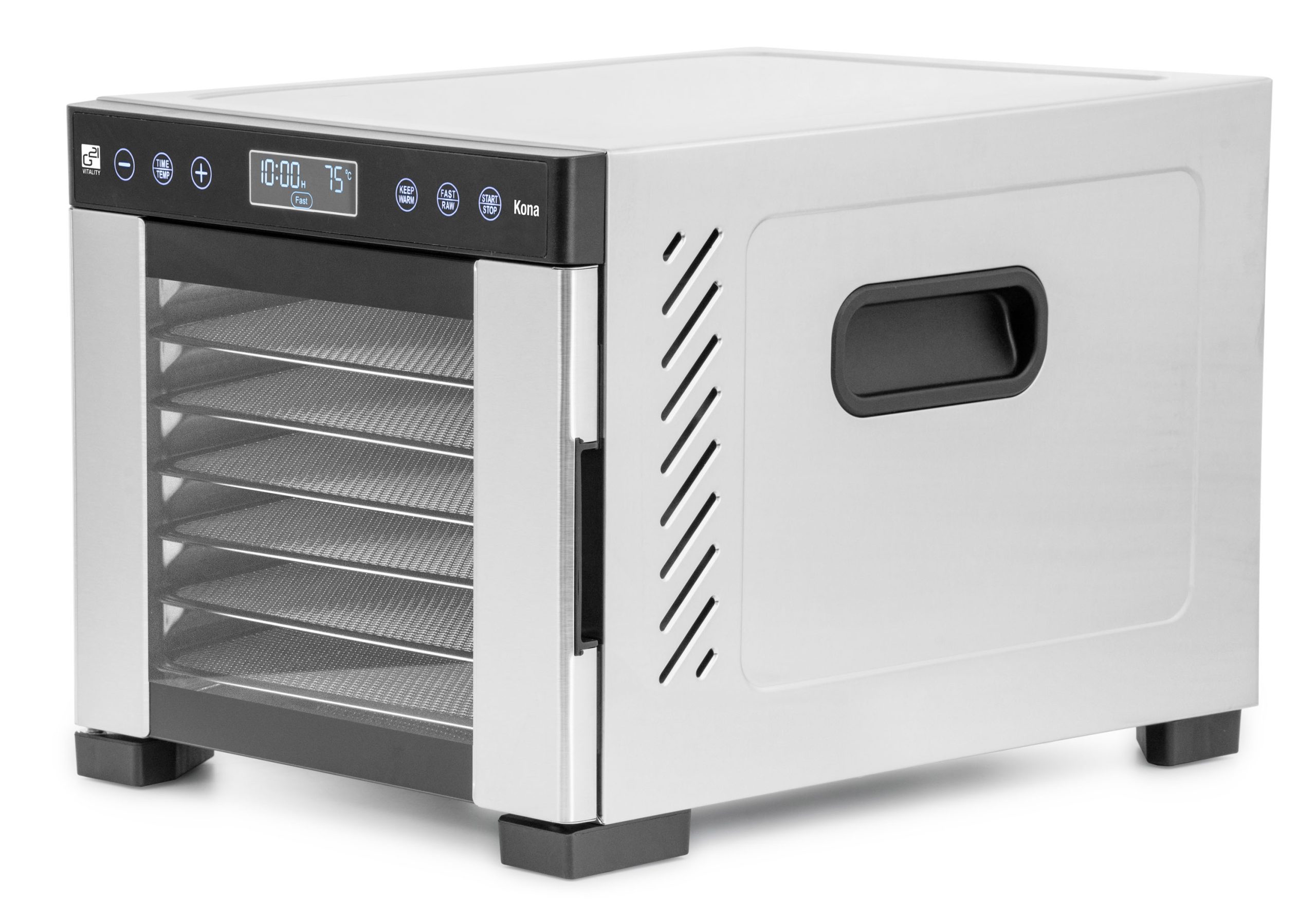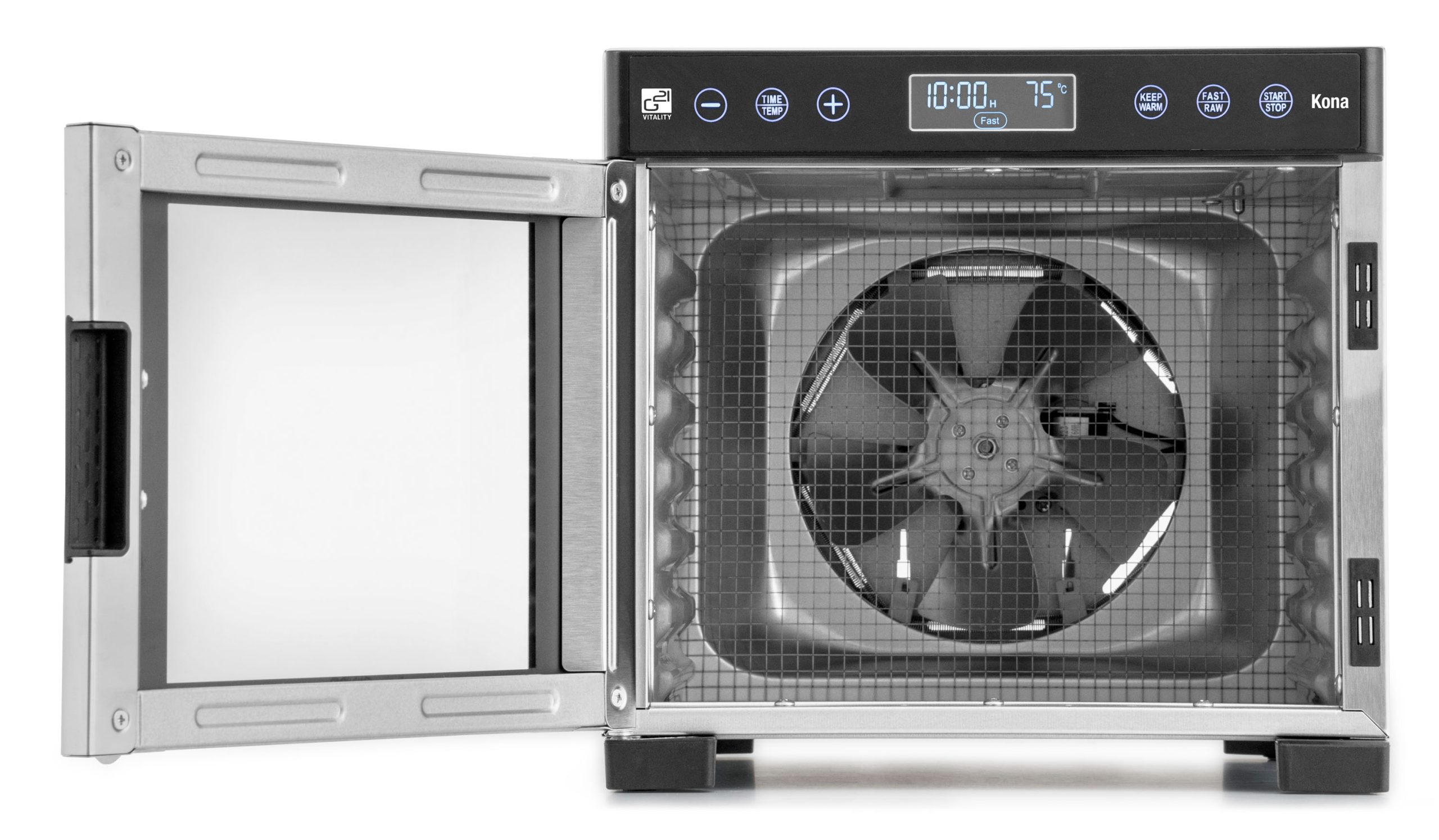 Míg az ebbe az árkategóriába tartozó többi szárító ventilátora alul van elhelyezve, így a szárított összetevőket tartalmazó tányért mozgatni kell a jobb szárítás érdekében, a Kona egy kategóriával magasabb kialakítású. A stratégiailag elhelyezett ventilátornak köszönhetően a levegő vízszintesen áramlik benne. Az elülső ablakkal ellátott ajtó emellett alacsonyabb energiafogyasztást , tökéletes légáramlást, hatékonyabb szárítást, valamint az élelmiszerek száradási idejét is lerövidíti.