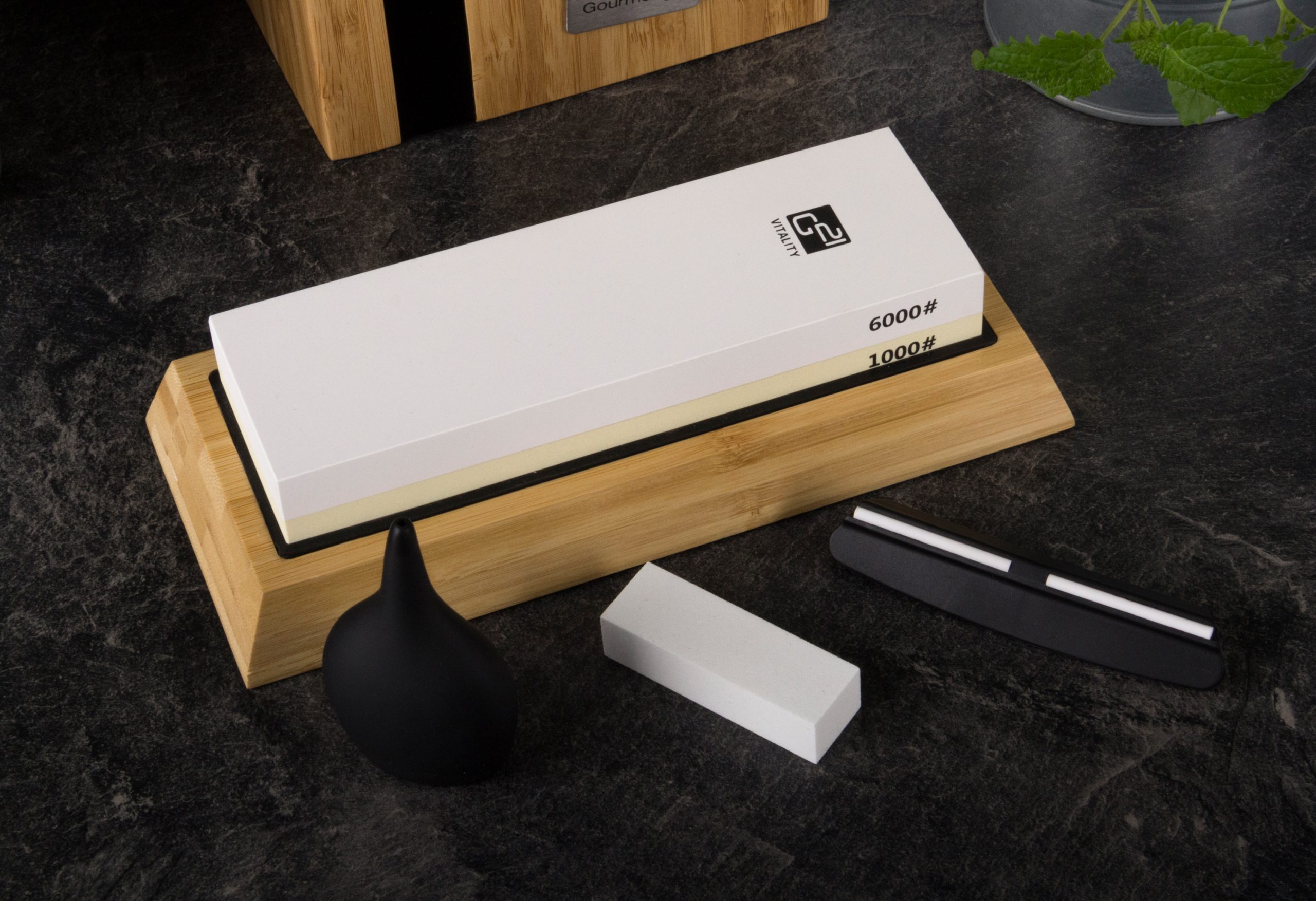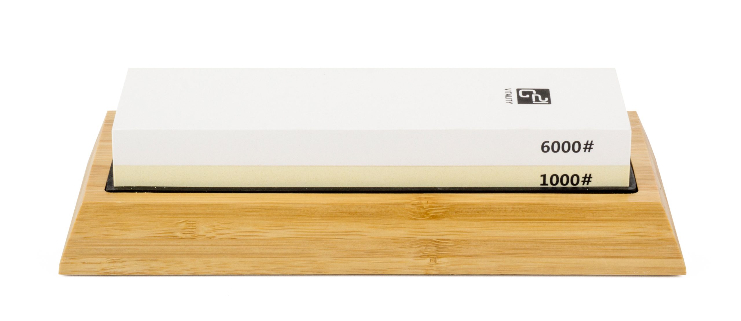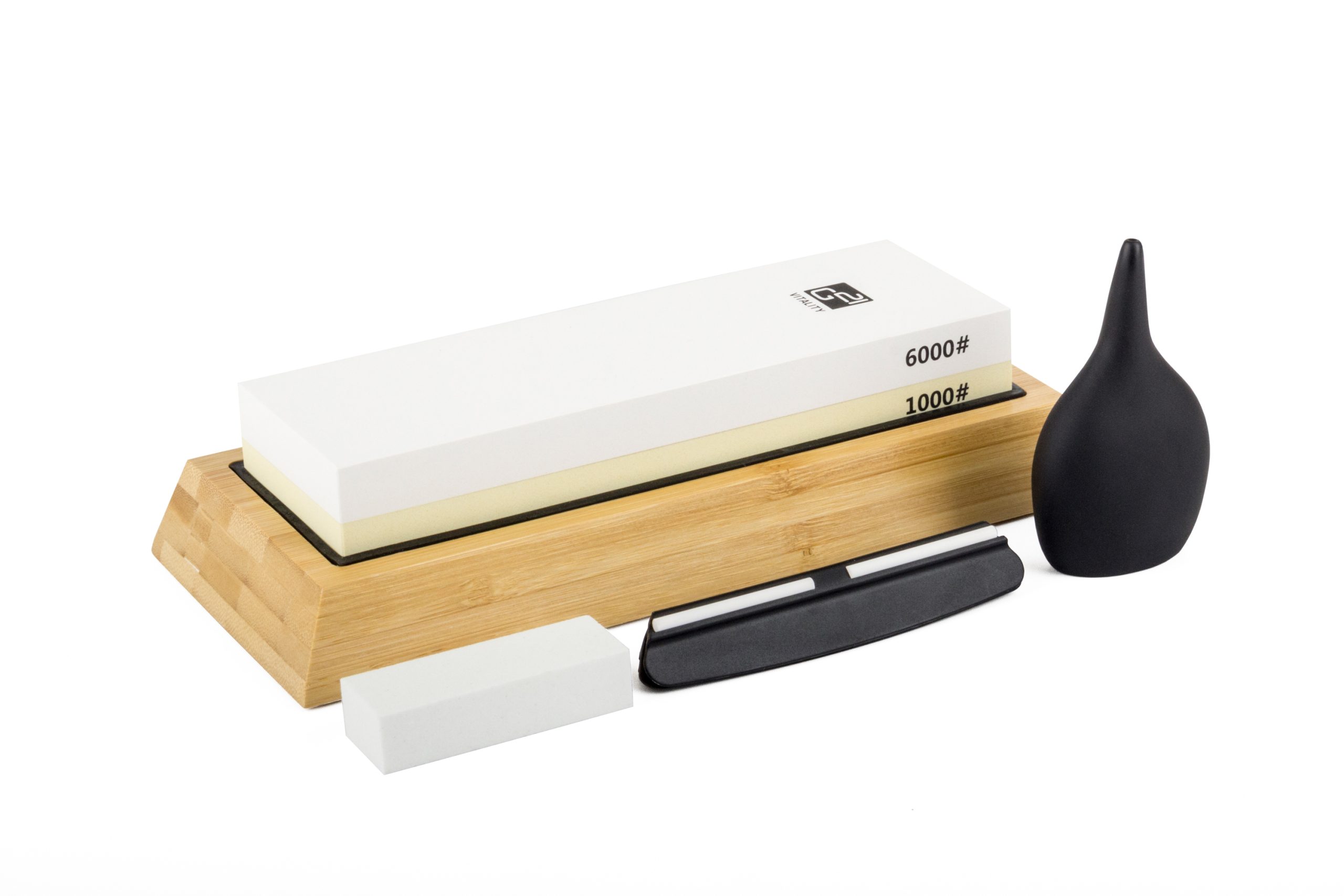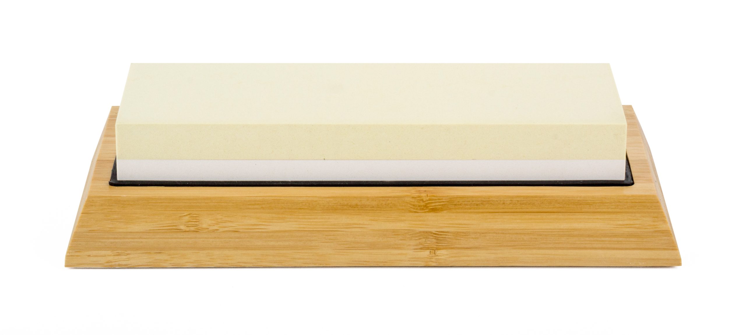 Kiváló minőségű korund kétoldalú élező 1000-es és 6000-es keménységgel a tökéletes késélezéshez. A bambuszblokkban megtalálható az élezőkő, a pontos szöget biztosító vezető, a felület kiegyenlítéséhez szükséges simító lapát, valamint a ballon a tartozék.