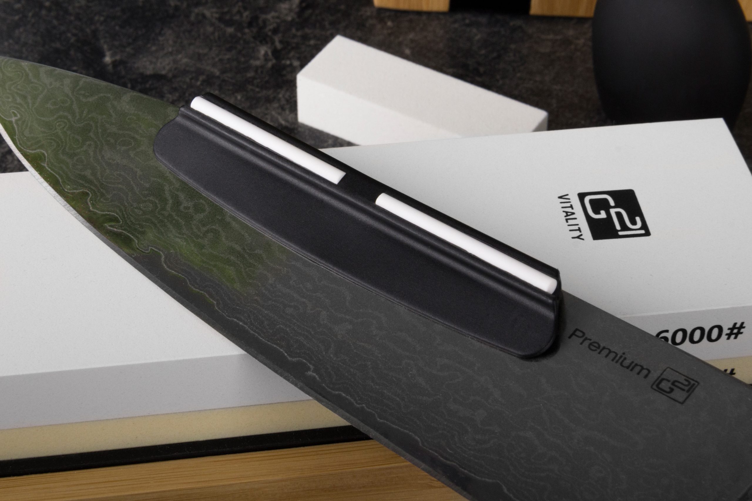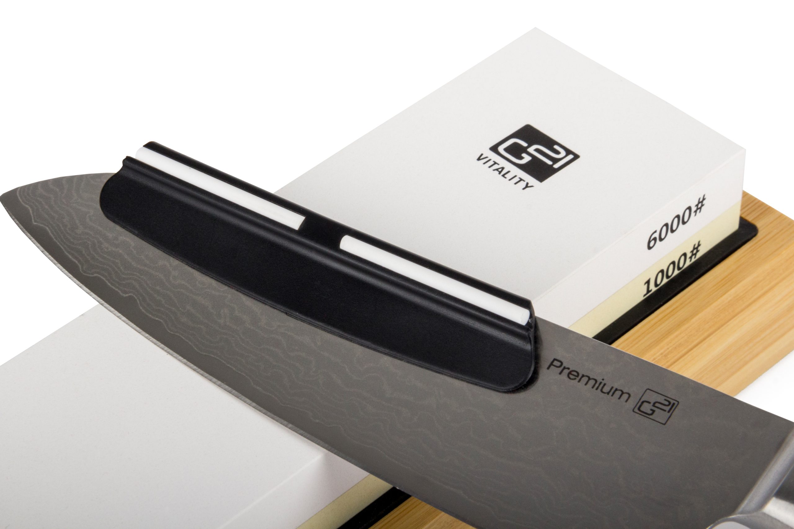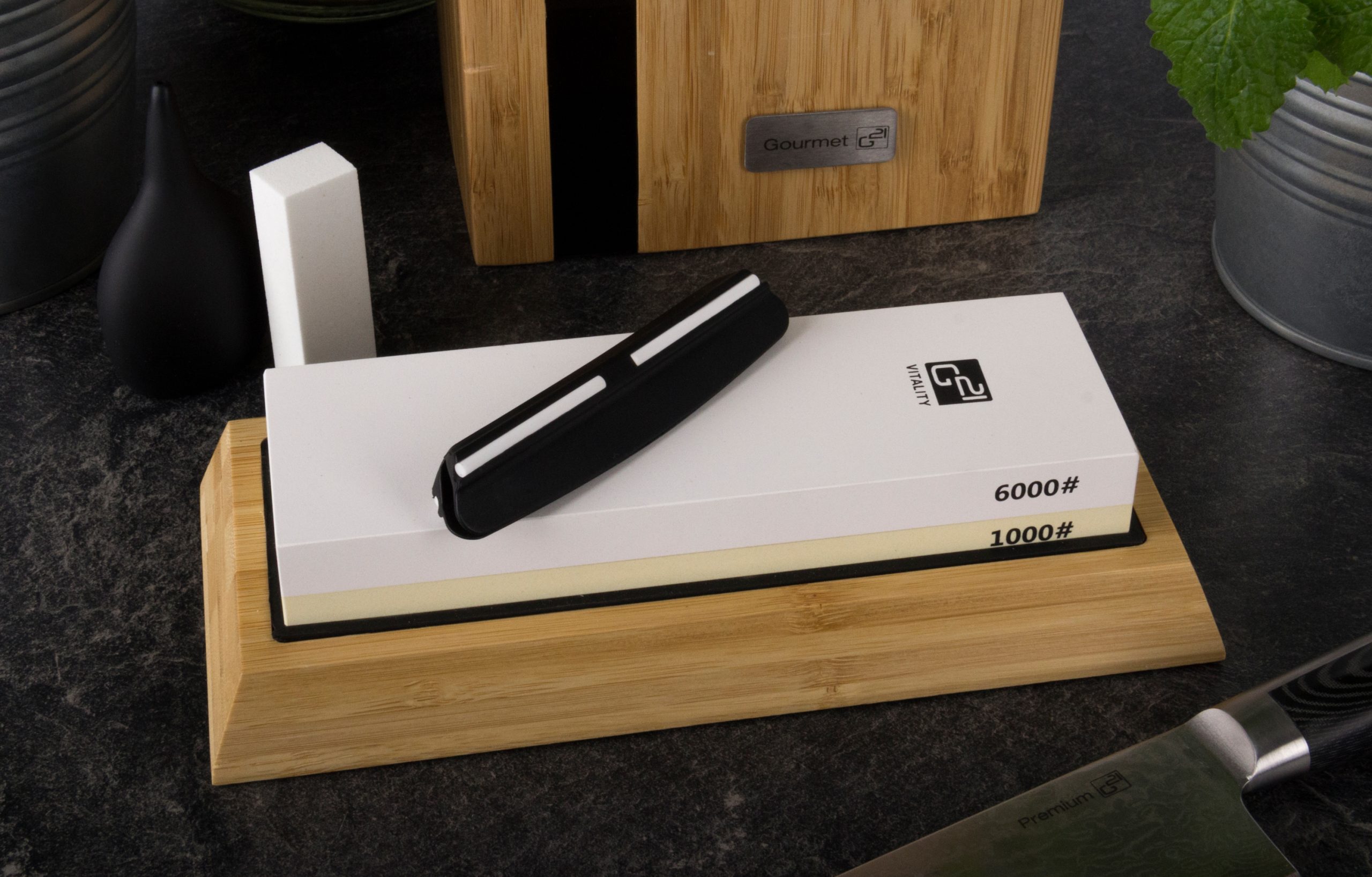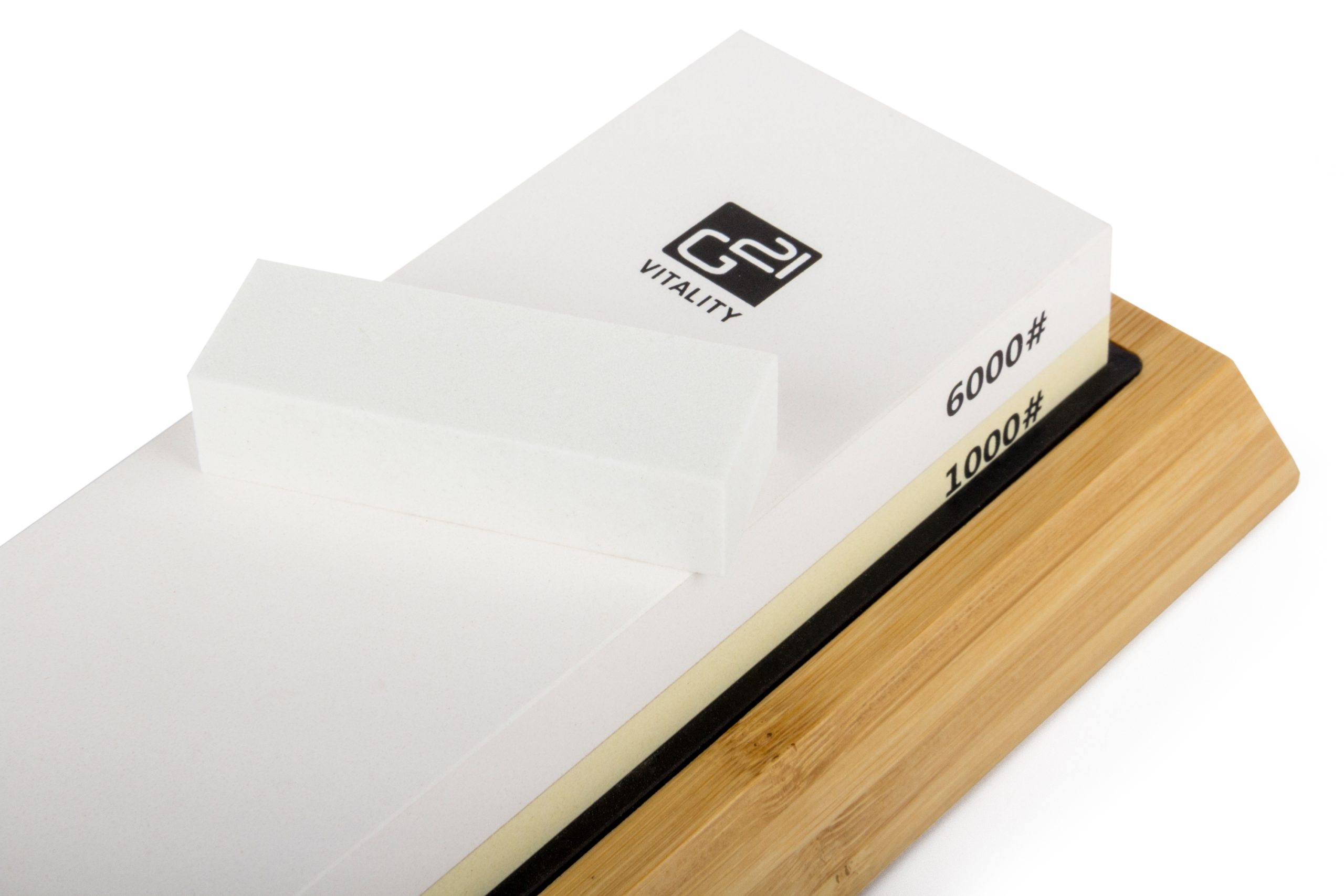 Kiváló minőségű korund kétoldalú élező 1000-es és 6000-es keménységgel a tökéletes késélezéshez. A bambuszblokkban megtalálható az élezőkő, a pontos szöget biztosító vezető, a felület kiegyenlítéséhez szükséges simító lapát, valamint a ballon a tartozék.