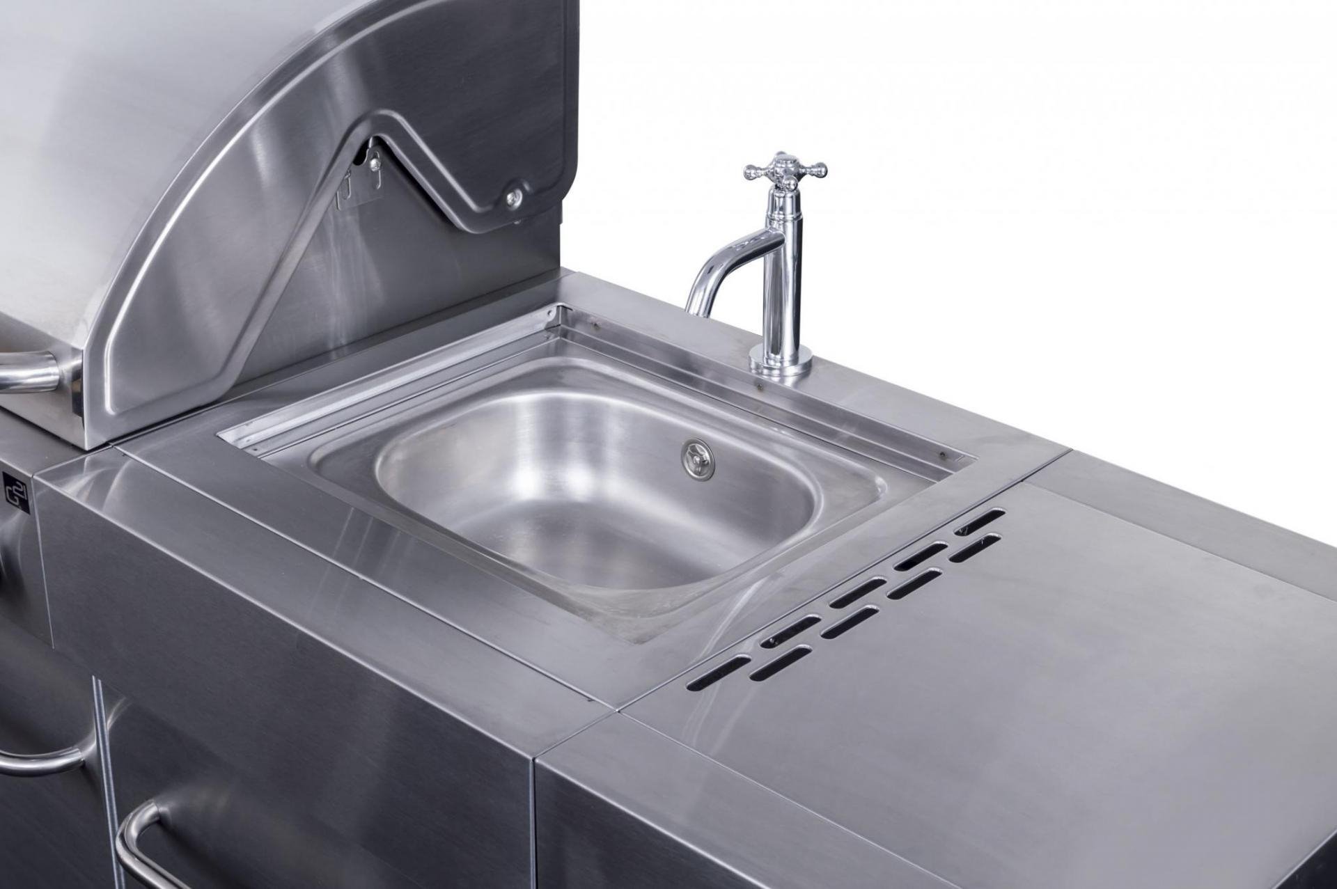 Minden egy helyen – egyszerre grillezhet, készítheti a köretet az oldalsó égőfejen, ráadásul a használt edényeket azonnal elöblítheti a beépített mosogatóban, anélkül hogy a grillező felszerelést hordozni kellene a házba és vissza.