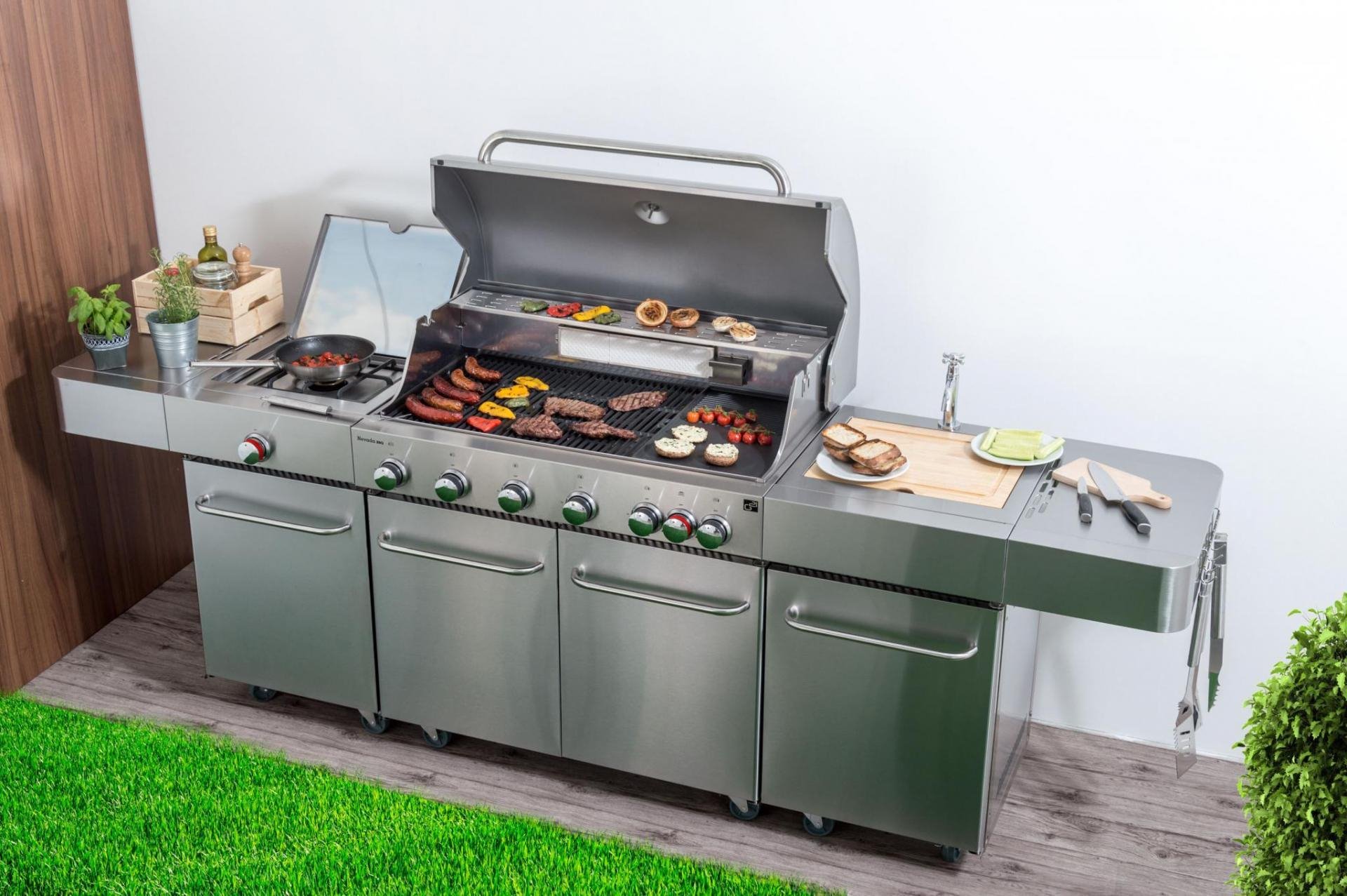 2020 újdonsága, 6 főégőfejjel, 1 oldalsó égőfejjel és 1 infravörös égőfejjel. A Nevada grillező konyha 8 égőfejjel, beépített mosogatóval, fedéllel, vágódeszkával és nagy munkafelülettel, ötletesen kialakított rakodó felülettel, a fedelében beépített hőmérővel Flame Tamer rendszerrel és meghoszabbított garanciával rendelkezik.