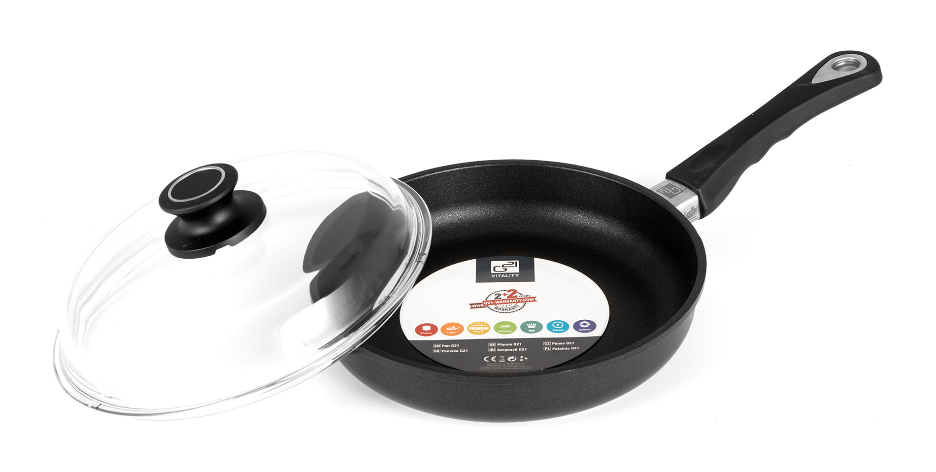 A G21 Prime serpenyő fedele edzett és tartós üvegből készült, fogantyúval. A serpenyő fedele ötletesen kialakított nyílással rendelkezik a forró gőz eltávolítására a fogantyú alatt. A fedéllel ellátott G21 Prime serpenyő nagy előnye a tartósság – mind a serpenyőt, mind a fedelet behelyezheti a sütőbe,és 240°C-ig sütheti vagy piríthatja az ételeket.