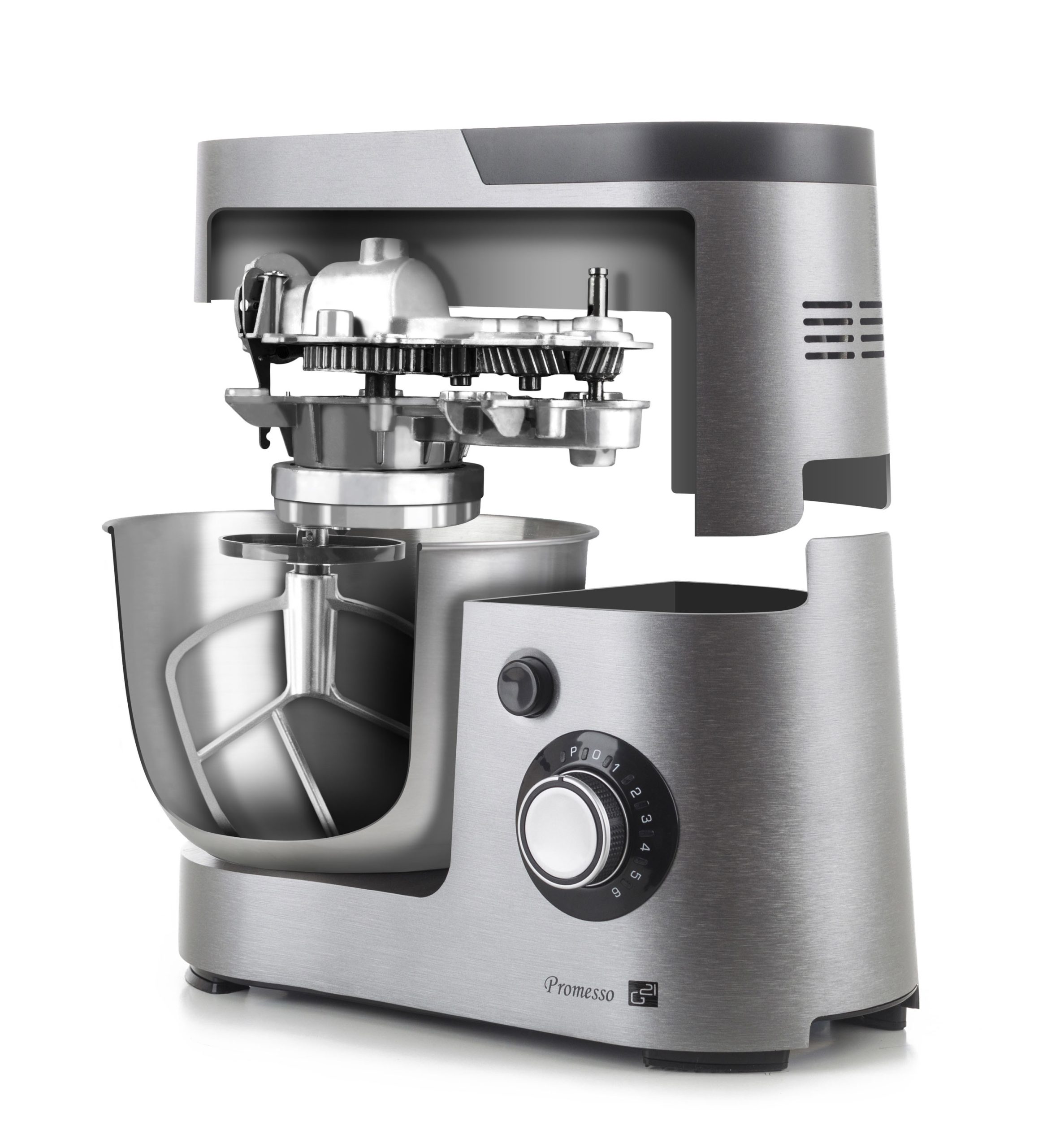 Nézze meg minden oldalról, masszív, fémből készült ház garantálja a megbízhatóságot. A fém valójában szinte minden. A fogaskerekektől és a belső alkatrészektől a dagasztóhorgokig és egyéb tartozékokig – minden fontos alkatrész fémből készült. Csak a burkolatok és a dugók műanyagok. A stabilitás biztosítása érdekében a G21 Promesso robotot csúszásgátló kezeléssel is elláttuk.