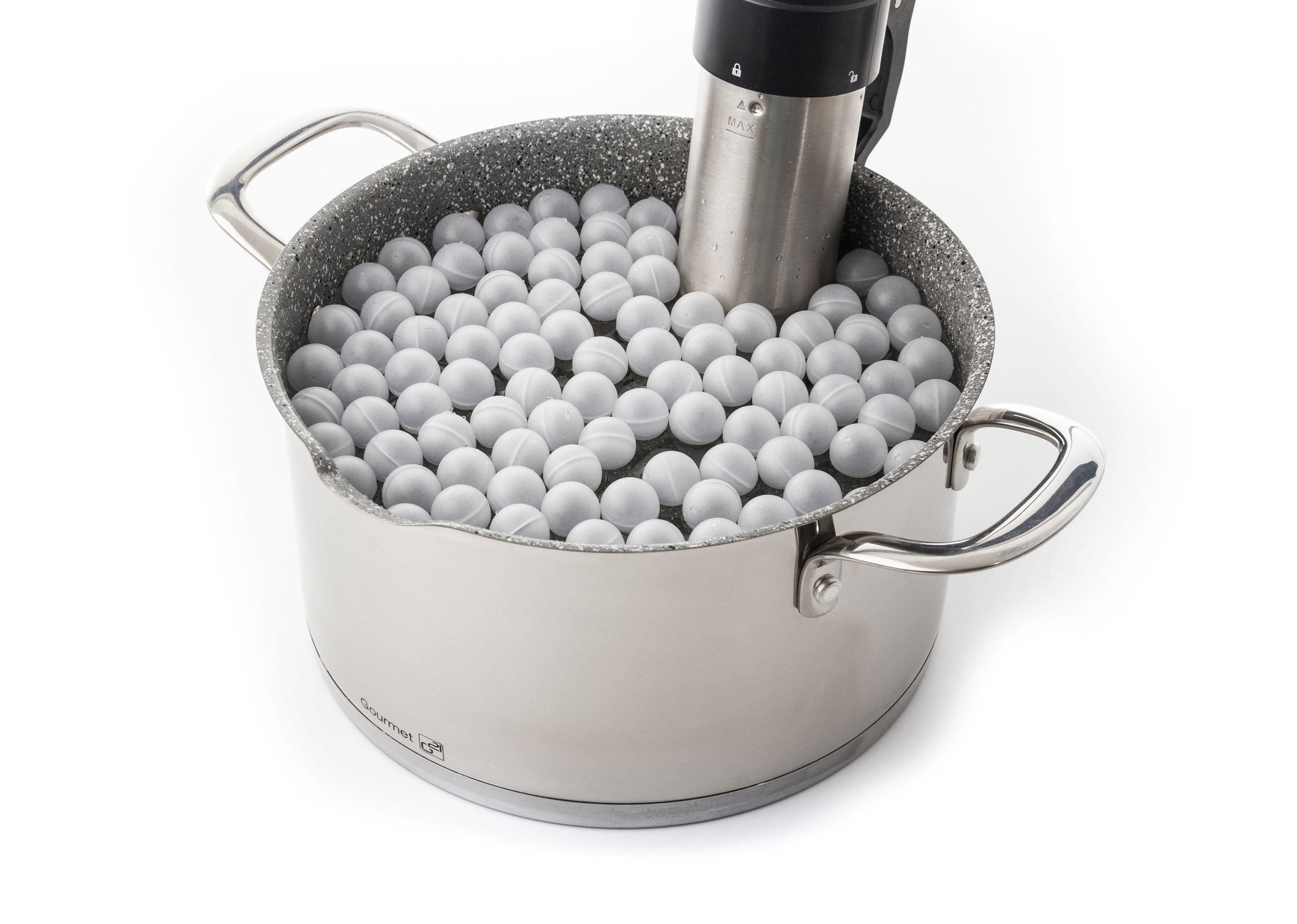 A merülő sous-vide főző nem teszi lehetővé a fedél használatát, ami megakadályozná a hő veszteséget és a víz párolgását. Ezért javasoljuk a G21 hőszigetelő golyók használatát – ezek lefedik az edény tetejét és megakadályozzák a hő szivárgást. A csomagban 100 db 2 cm átmérőjű golyót talál, amelyek PP műanyagból készülnek. Céljuk a vízfürdőből származó hő visszatartása és ez által a sous-vide főzés során bekövetkező veszteségek megakadályozása.