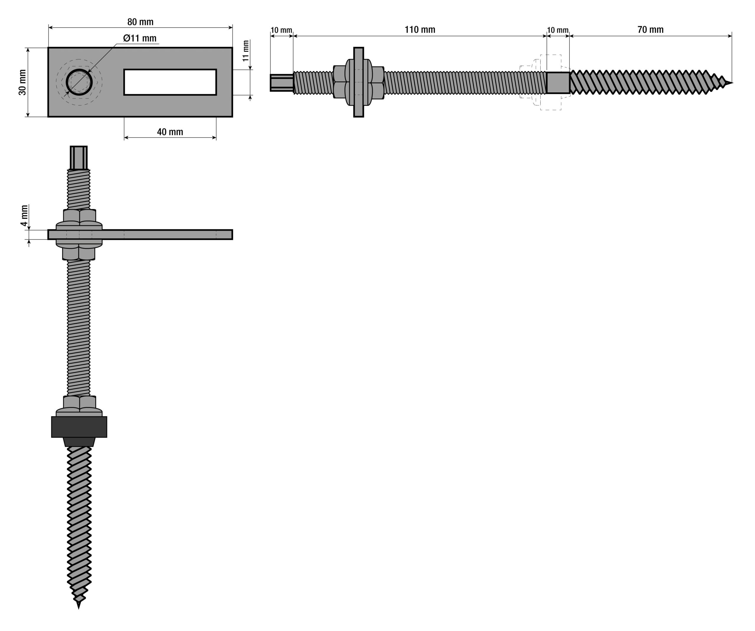 - 1x tőcsavaros tetőkampó M10x200 3 peremanyával M10 DIN 6923 és 1 tömítő gumival