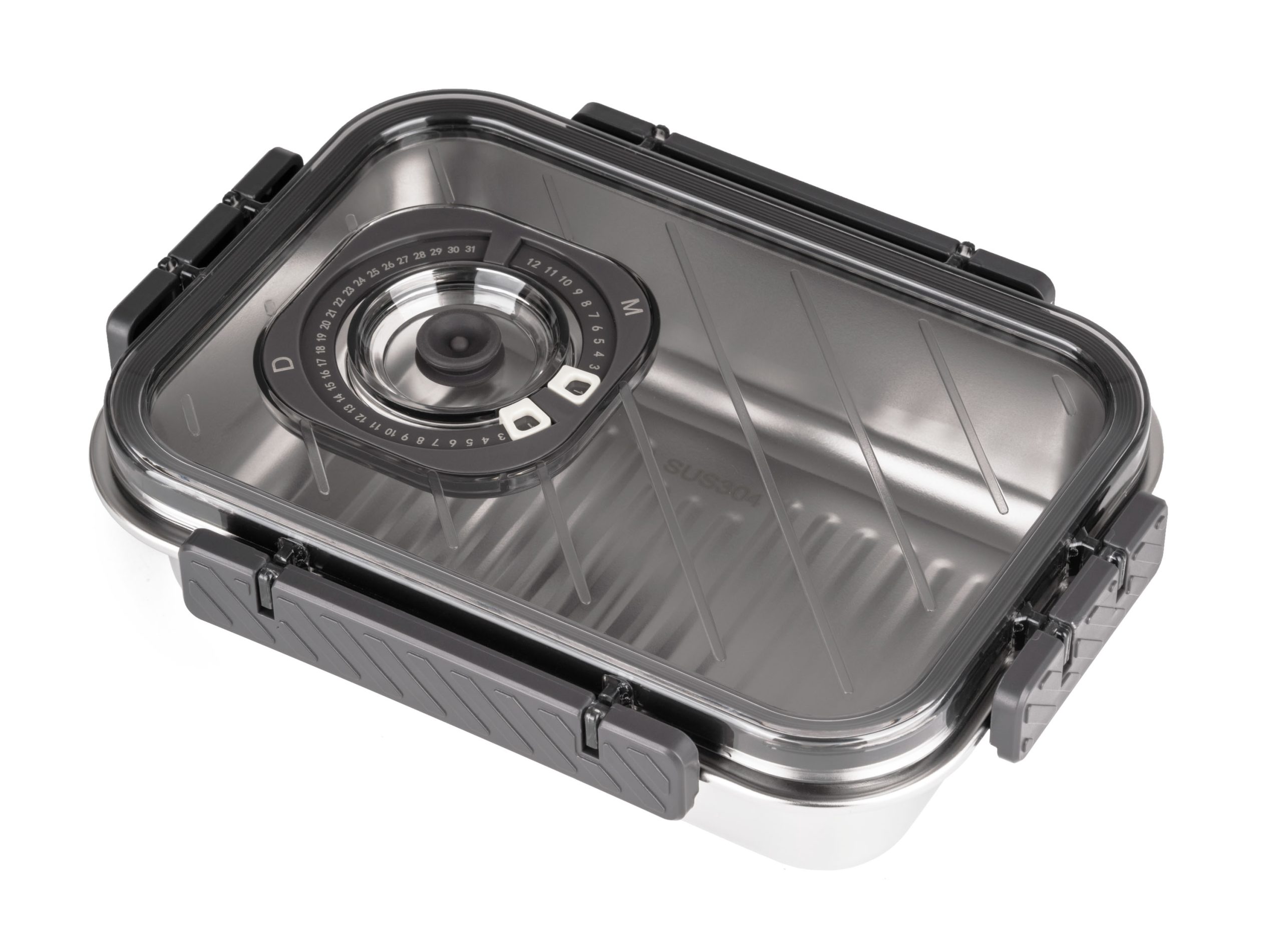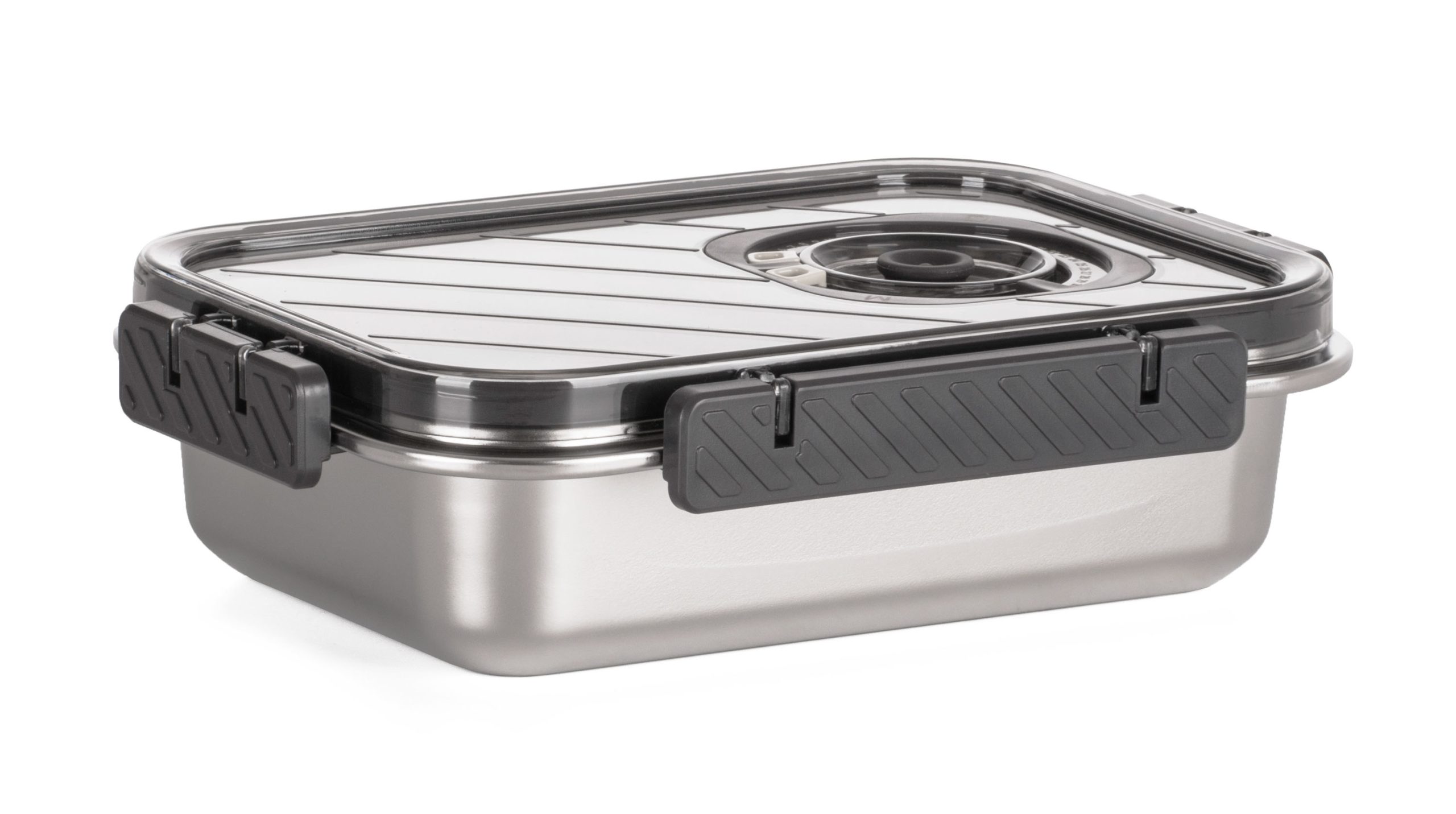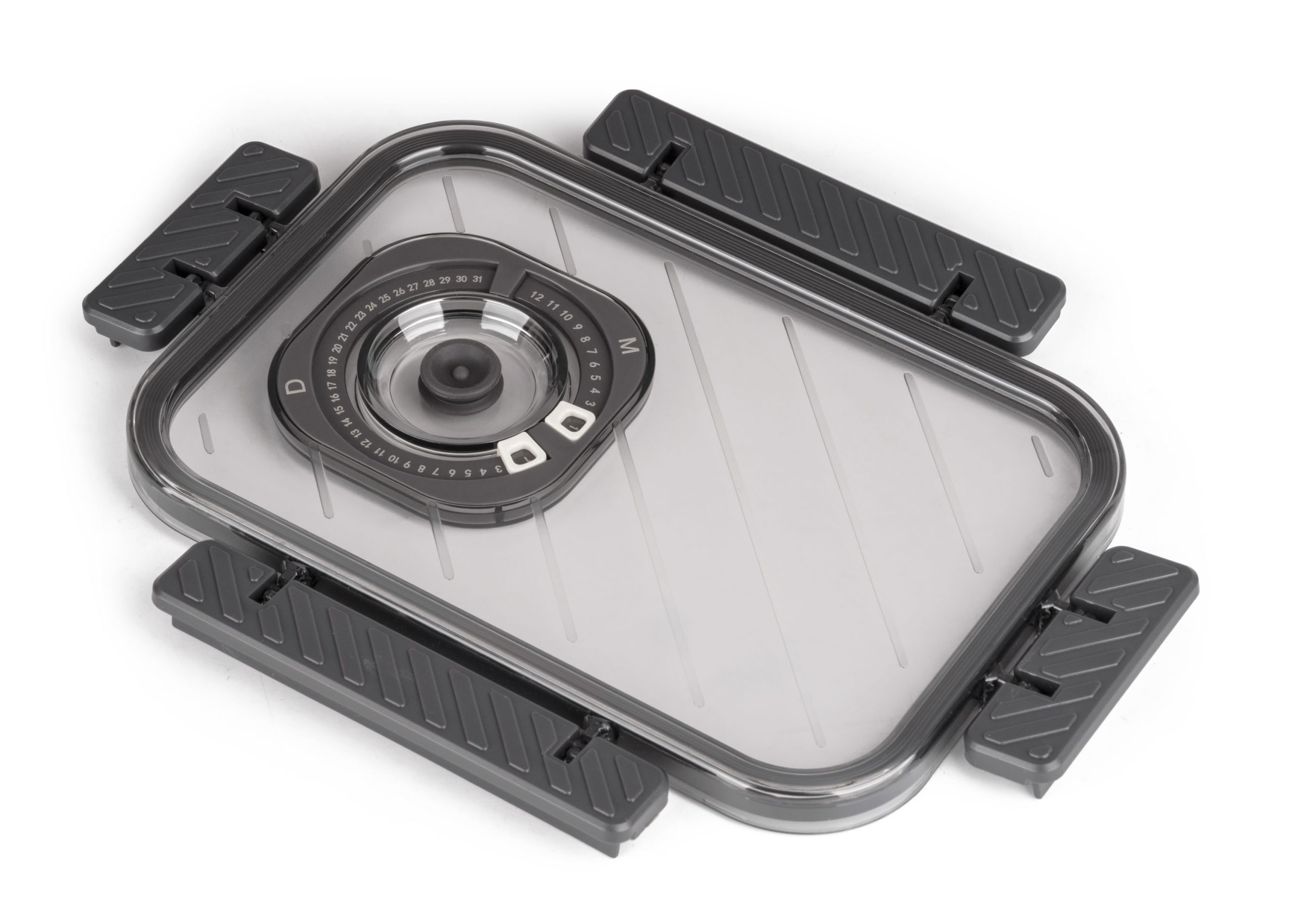 A BPA-mentes műanyagból készült fedél vákuumszeleppel és állítható dátumjelzővel rendelkezik. Így mindig tudni fogja, mikor vákuumozták az ételt, vagy meddig fogyasztható. A fedél közepén található szelep enyhe megnyomásával egyszerűen kiengedheti a vákuumot és kinyithatja a dobozt.