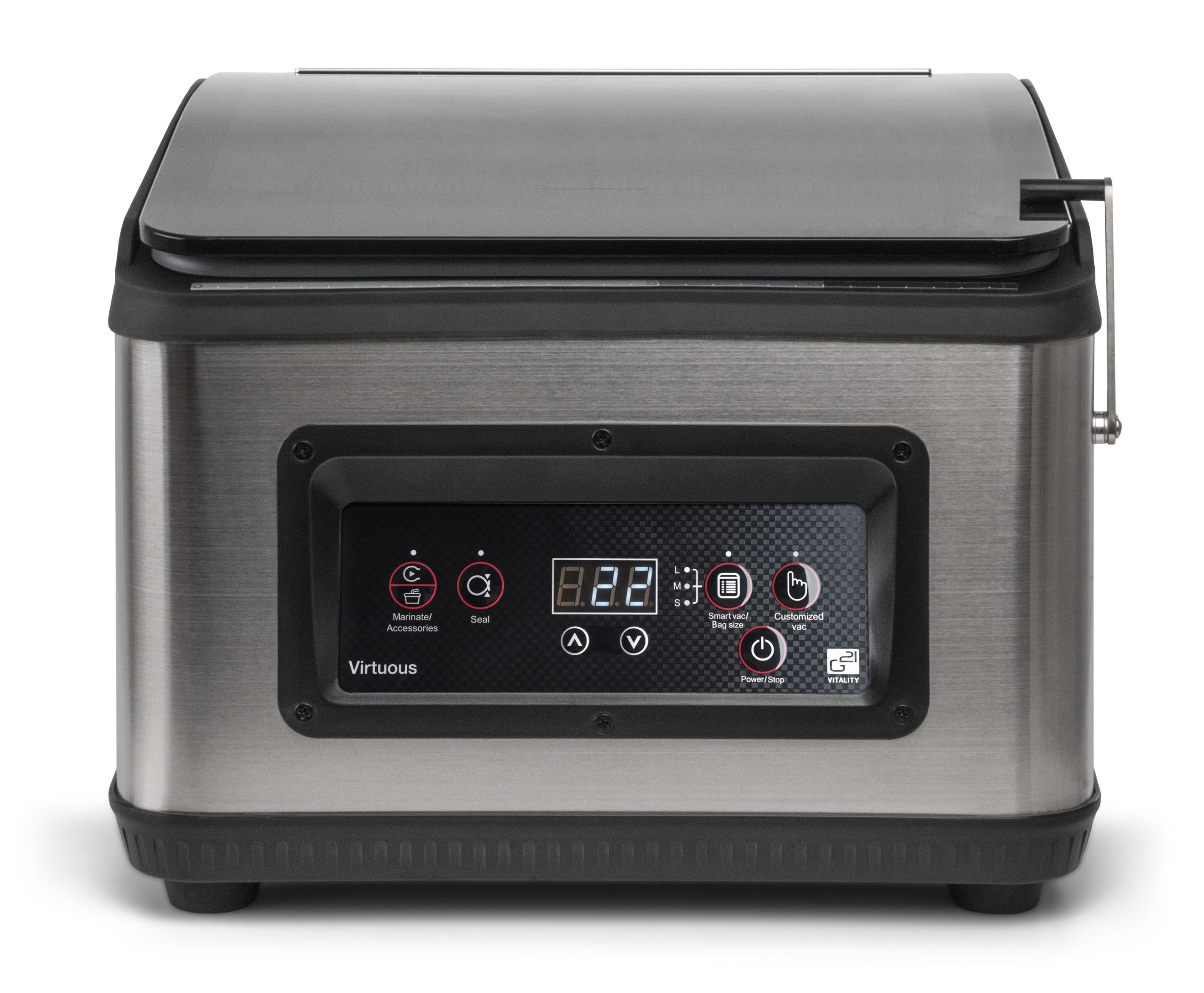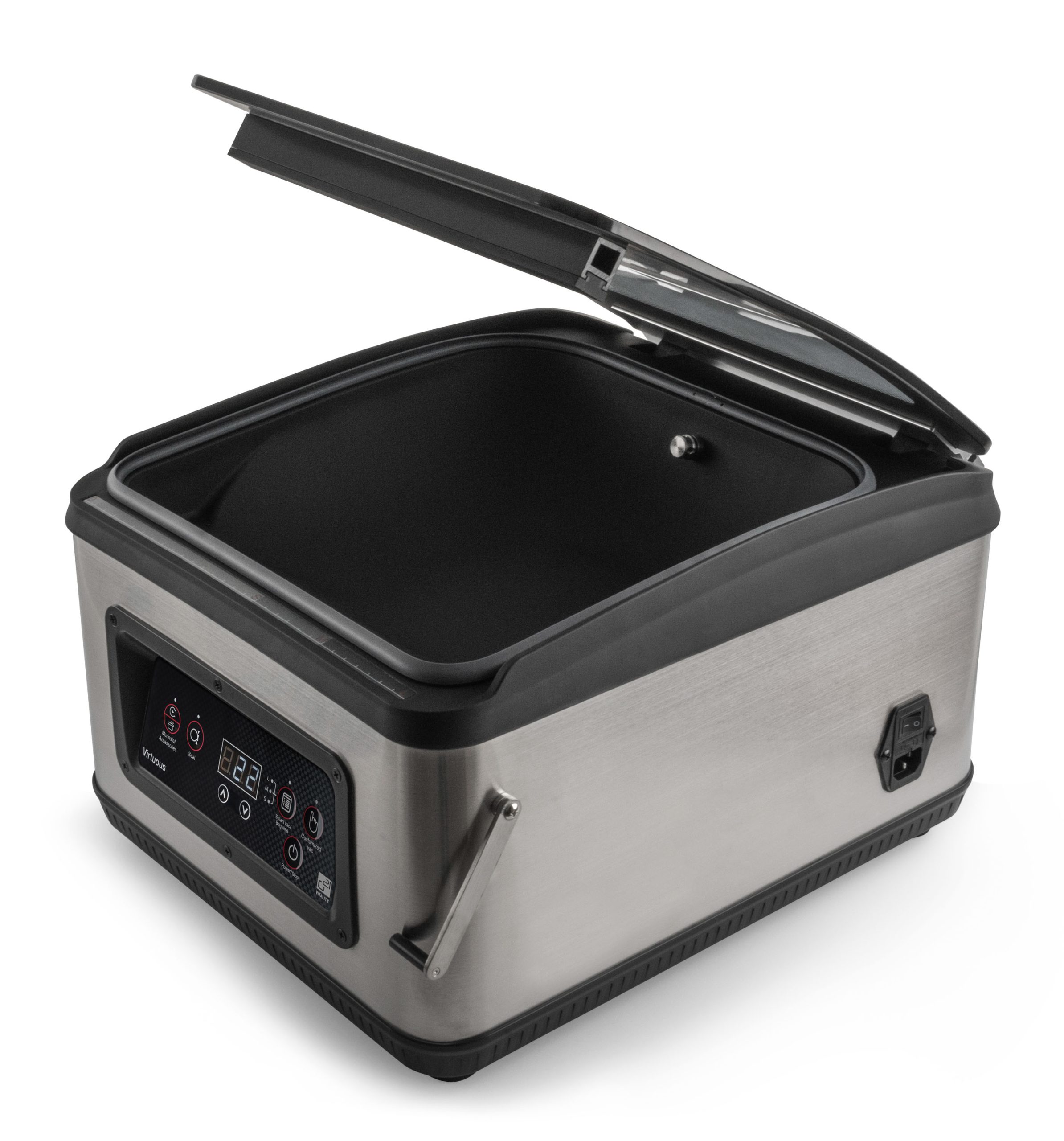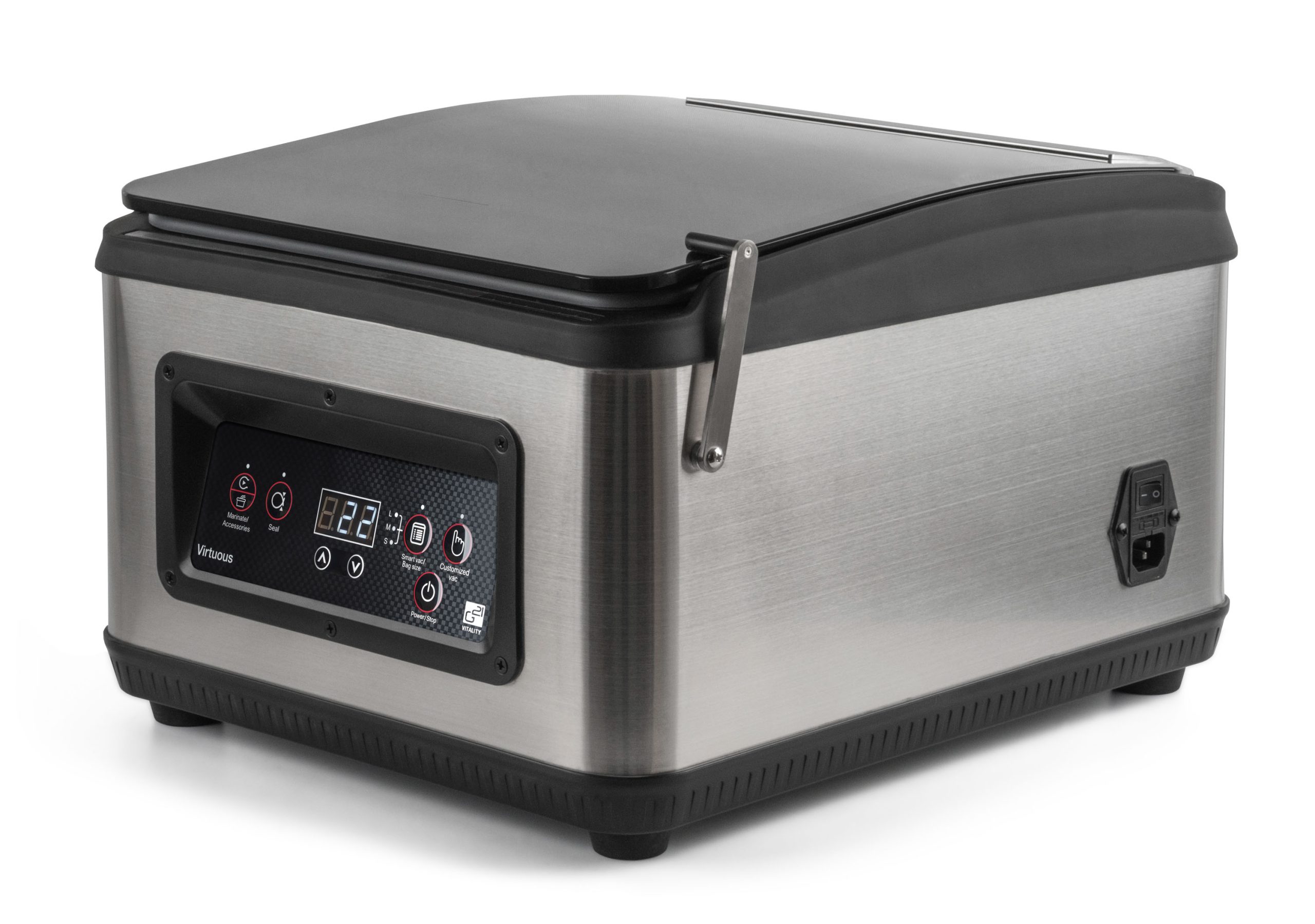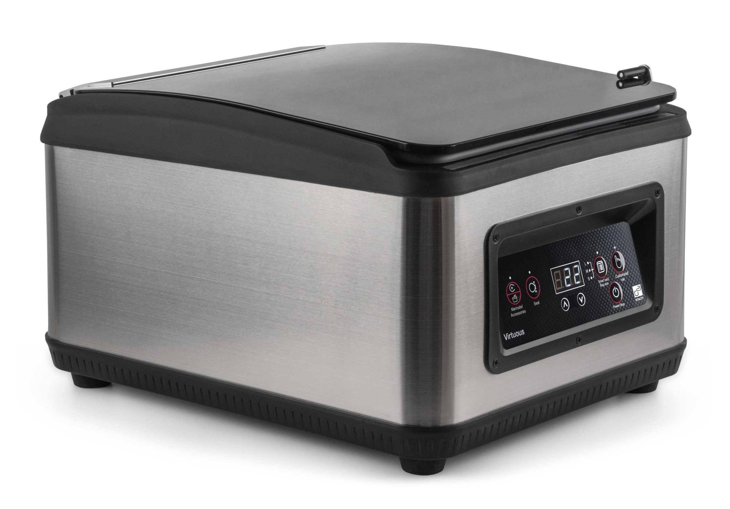 Intelligens vákuumozó kettős szivattyúval a szilárd és folyékony élelmiszerek megbízható vákuumozásához. Vagy a saját 6 literes vákuumkamrájában vákuumozod, vagy használhatsz vákuumtartályokat, konténereket és zacskókat vagy fóliát. Az egyedülálló G21 vákuum speciális funkciókkal is rendelkezik.