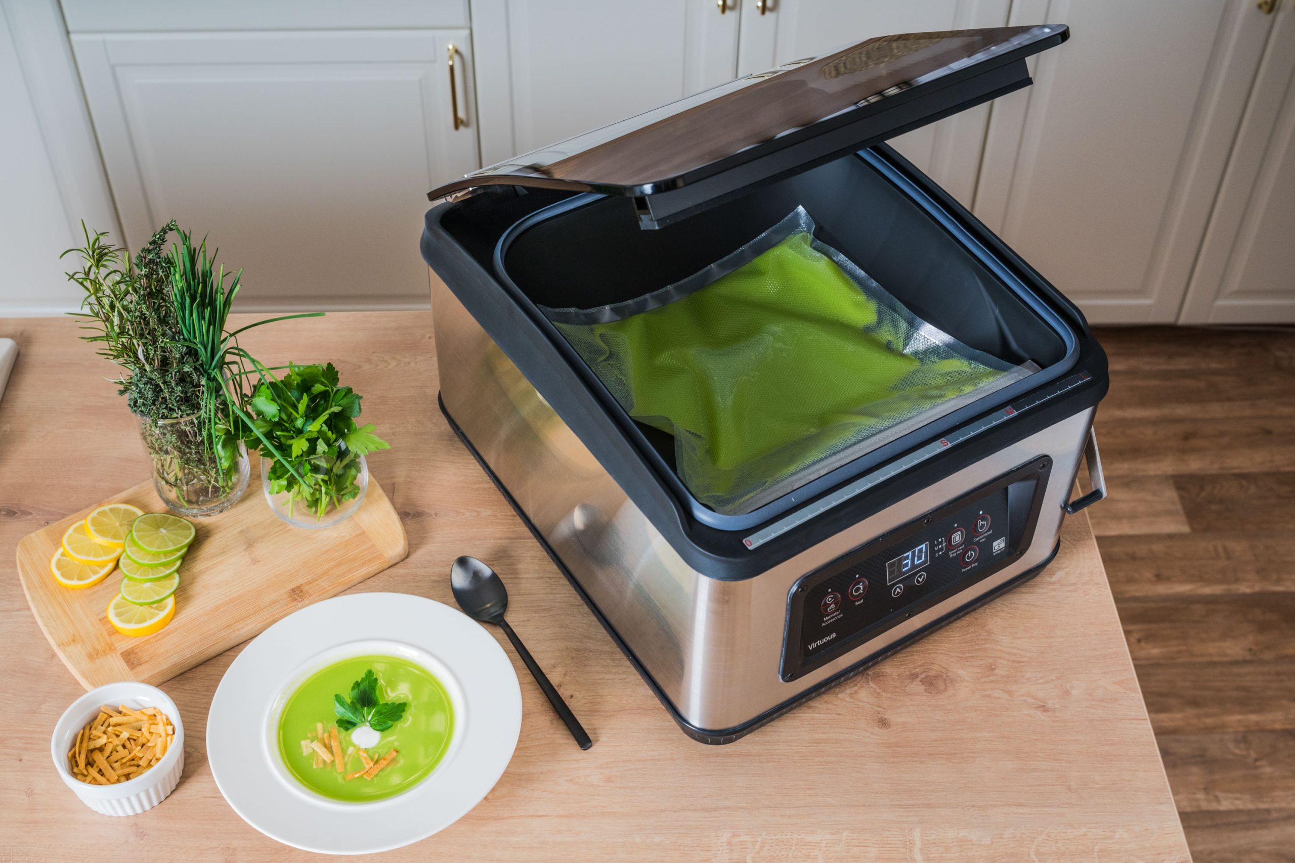 A G21 vákuumozó nem csak szilárd összetevőket képes vákuumozni, hanem tökéletesen elszívja a levegőt, amikor leveseket, szószokat, koktélokat és más folyékony vagy félig folyékony összetevőket és ételeket vákuumoz ki.