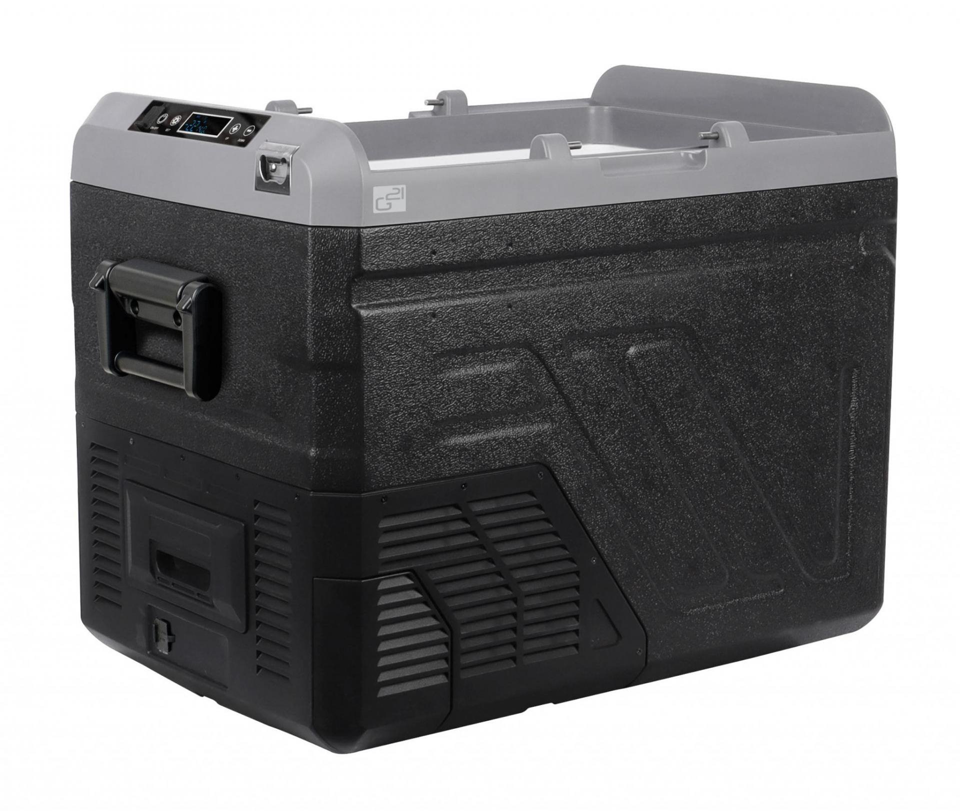 Kompresszoros hűtőláda használható autóban és háztartásban, 12/24 V és 240 V-os csatlakozó kábeleket tartalmaz. 50 l űrtartalom, megfordítható fedél, USB és USB-C kimenet, palacknyitó.