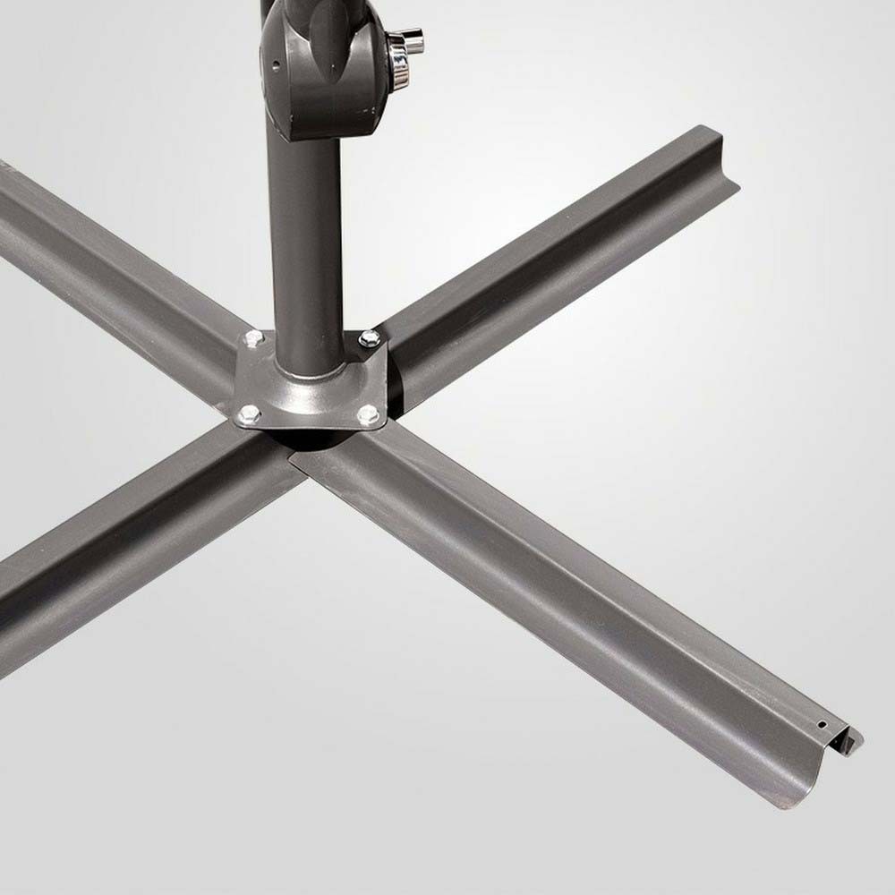A kerti ernyő stabilitását jelentősen befolyásolja a kereszt talp. Az Ön kényelme érdekében egy fogantyú van rögzítve a termék összecsukásához és összecsukásához. A kitámasztó tetején lévő lombkorona lehetővé teszi a lombkorona tetszőleges elhelyezését és bármely árnyékoló hely kiválasztását a napfény beesési szöge szerint. Az ernyő szellőzője lehetővé teszi a levegő keringését.