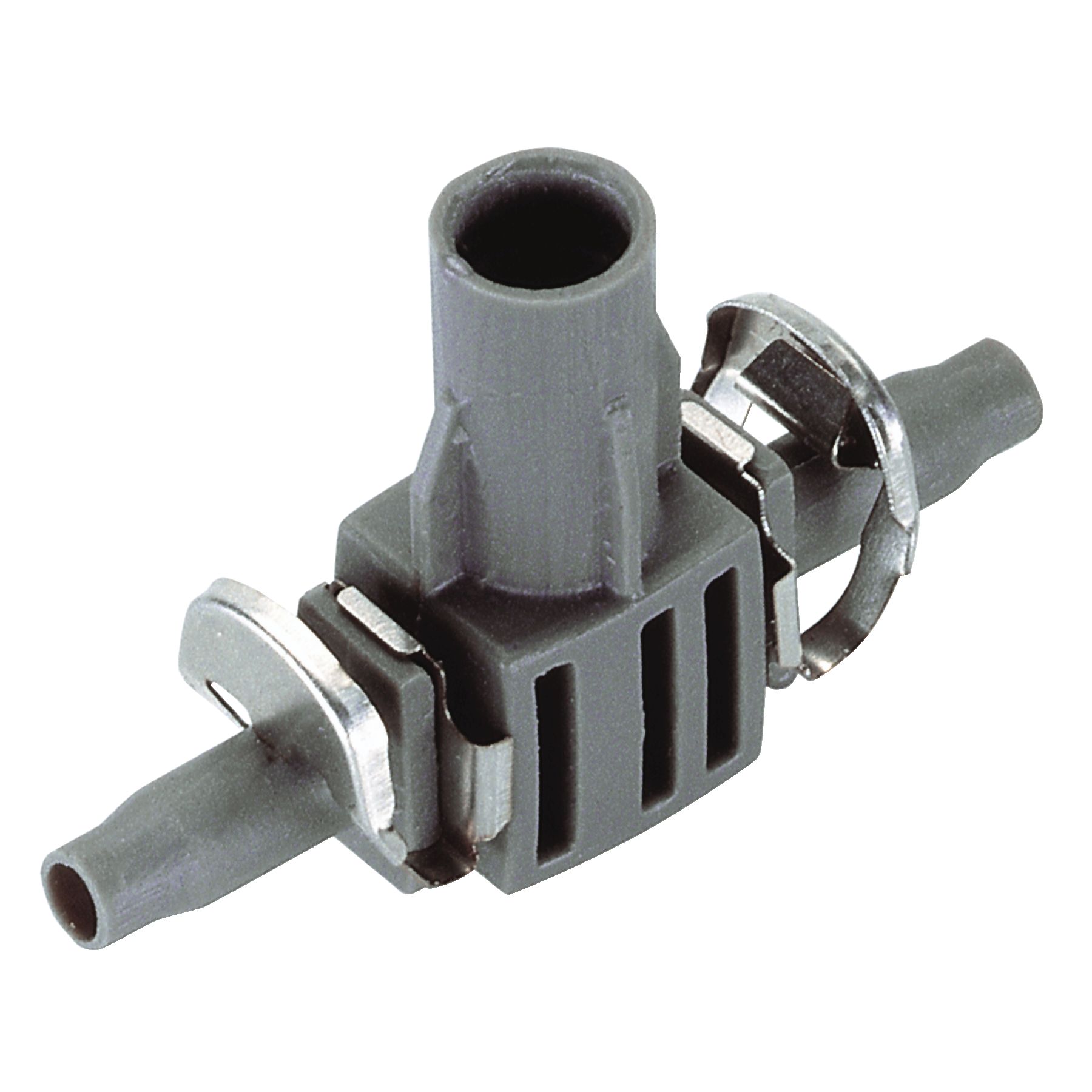 A GARDENA T-elem permetezőfúvókákhoz a GARDENA Micro-Drip-System részeként lehetővé teszi a permetezőfúvókák csatlakoztatását a 4,6 mm-es (3/16″) vezetékcsőhöz. Ez 8327-20 vagy 8379-20 cikkszámú csőtartó felhasználásával történik. A T-elem kitűnően alkalmas a permetezőfúvókák meghosszabbítására hosszabbítócső (cikkszám: 1377-20) segítségével. A szabadalmaztatott „Klikk és Kész” gyorscsatlakozási technológiának köszönhetően különösen egyszerűen csatlakoztatható 4,6 mm-es (3/16″) elosztócsőhöz. A csomag öt T-elemet és öt zárósapkát tartalmaz.