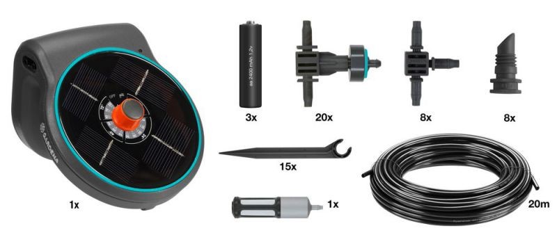 Alkalmazás: akár 20 növényre Öntözési program: 14 program közül választhat Vízmennyiség: nyomáskompenzáló sorcseppenként: kb. 0,5 l / h Energiaellátás: A napelem 3 újratölthető akkumulátort tartalmaz Vízellátás: Napelemes vezérlés egy integrált, elektronikus szivattyúval szívja be a vizet és elosztja a növények között