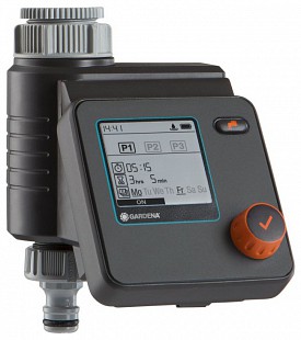 Három különböző, egymástól független öntözést is beállítható Az egység elemmel üzemel és közvetlenül a csapra csatlakozik Egyetlen forgó- és nyomókapcsolóval kiválaszthatók és megerősíthetők az adatok. Könnyen olvasható LC kijelzőn minden beállítás egyidőben látható. Az időjárásálló programozóegység eltávolítható