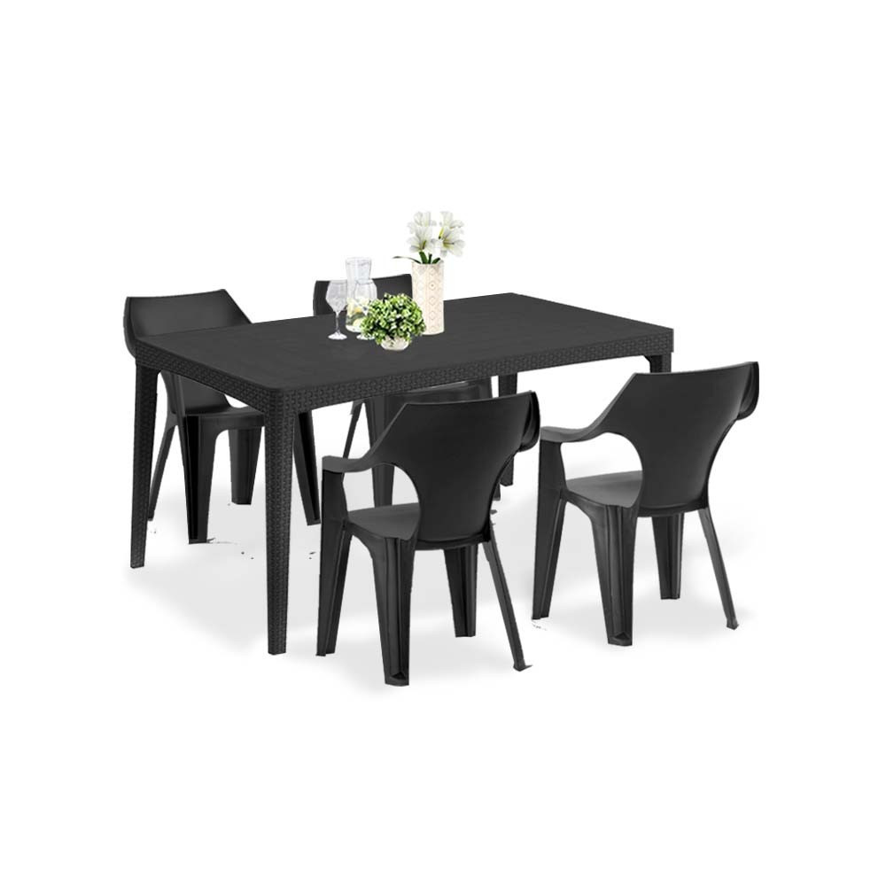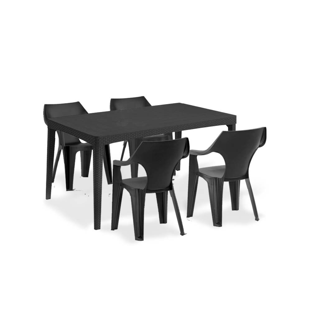 A grafit színű műanyag kerti bútor szett négy darab 57 x 57 x 79 cm-es székből és egy 160 x 90 x 74 cm-es asztalból áll. Ez egy kiváló minőségű termék, amely a legjobb minőségű fröccsöntött műanyagból készült.