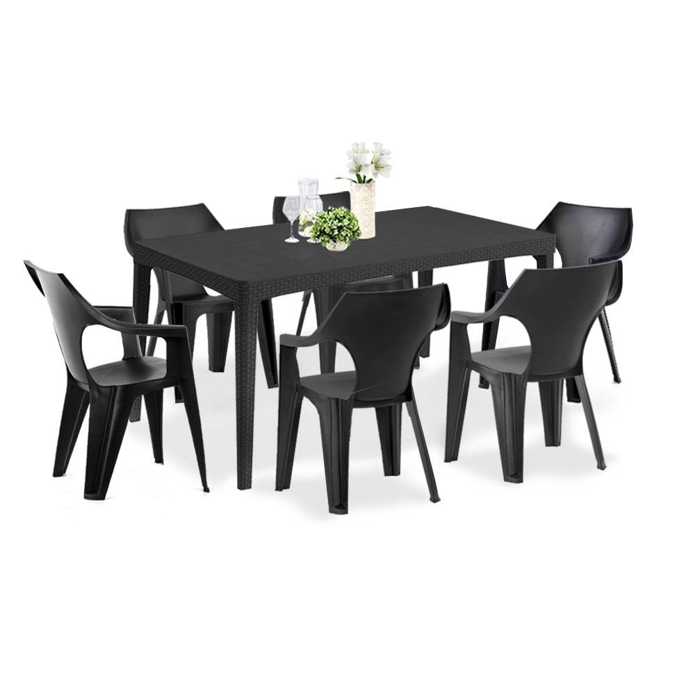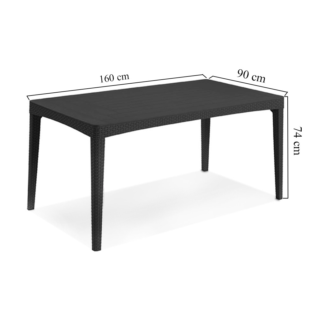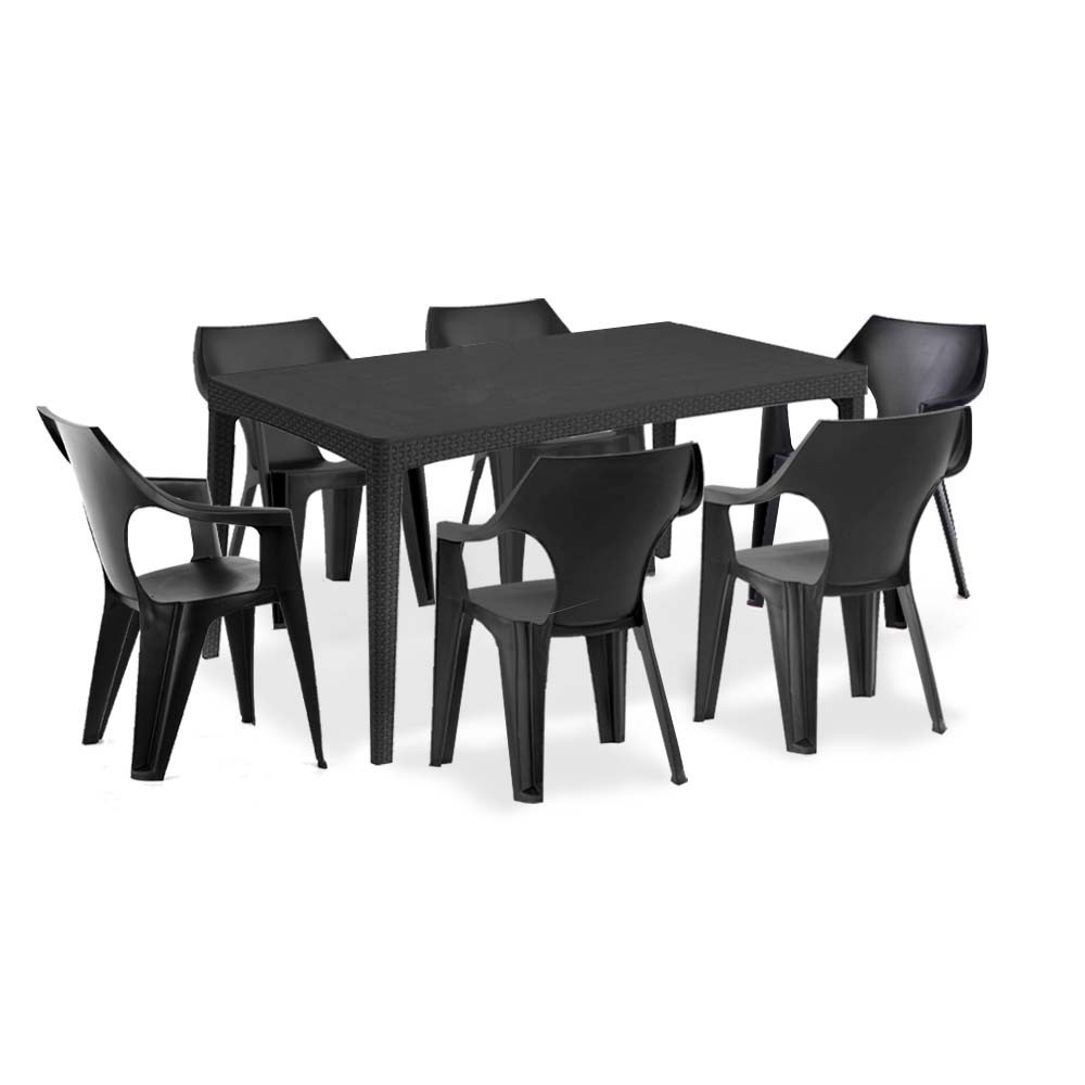 A grafit színű műanyag kerti bútor szett hat darab 57 x 57 x 79 cm-es székből és egy 160 x 90 x 74 cm-es asztalból áll. Ez egy kiváló minőségű termék, amely a legjobb minőségű fröccsöntött műanyagból készült.