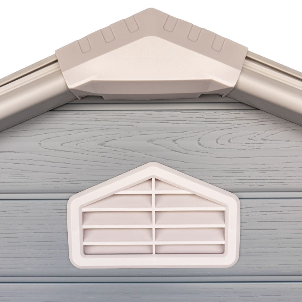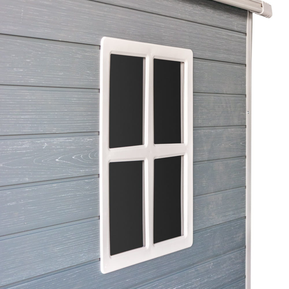 A kerti ház egy ablakkal van felszerelve, amely biztosítja a nappali fényt, ami megkönnyíti a rendszerezést és a szükséges eszközök megtalálását. Ezenkívül az elülső és a hátsó falak tetején található szellőzőnyílások biztosítják a megfelelő légáramlást, amely megakadályozza a nedvesség és a kellemetlen szagok felhalmozódását a házban.