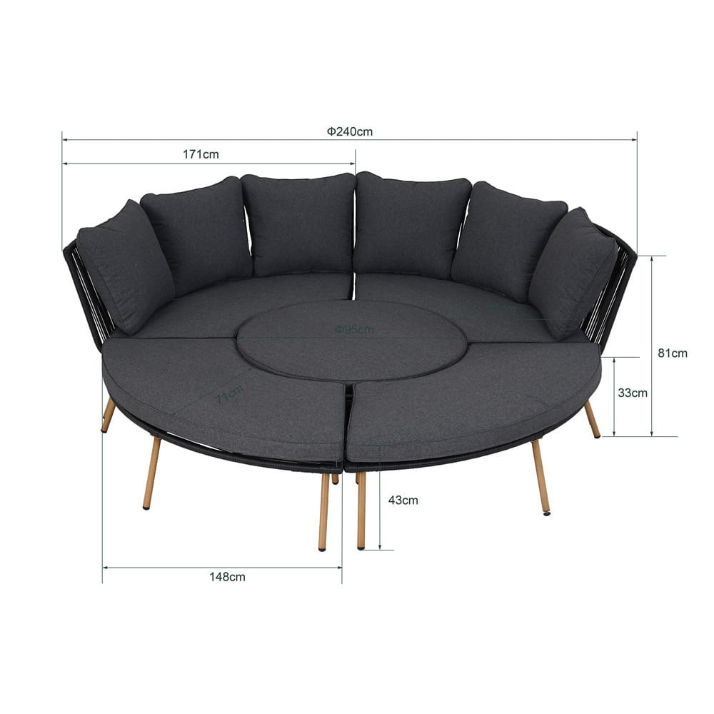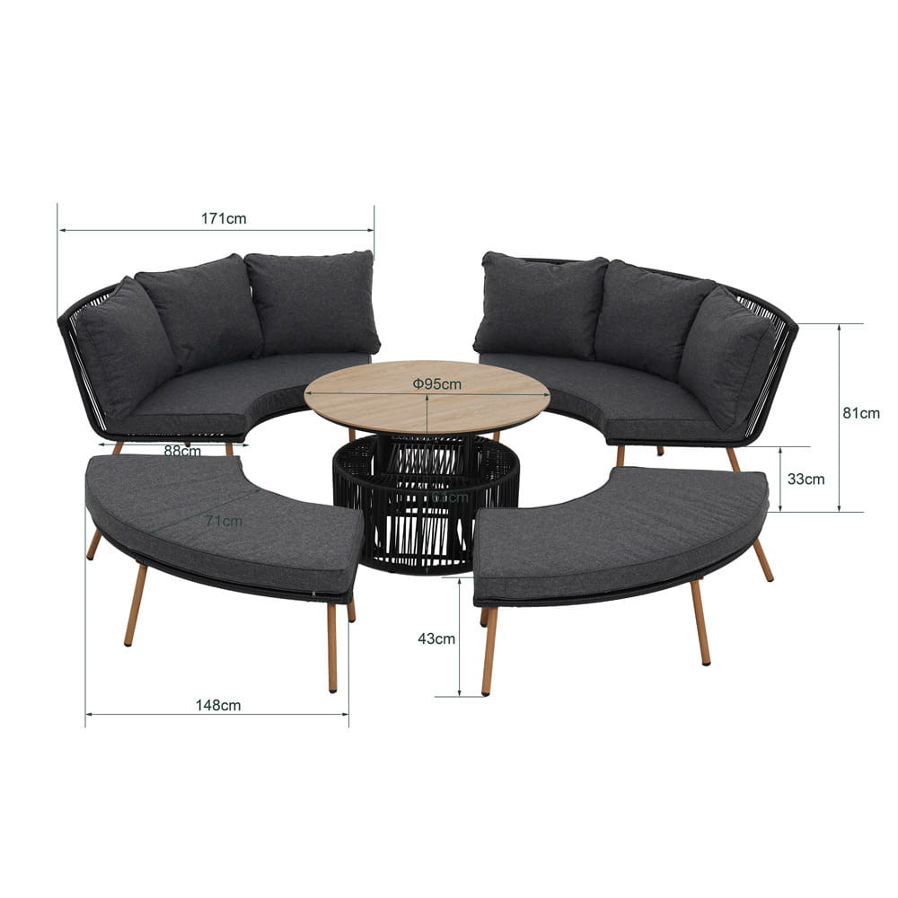 Kerti bútorkészlet, amely forradalmasítja kertje vagy terasza elrendezését. A kör alakú egyedi kialakítás egyedi karaktert ad a térnek. A 2 részre osztott kanapé 6 fő leültetésére alkalmas, a kényelmes padok pedig 4 további pihenőhellyel bővítik a pihenést.