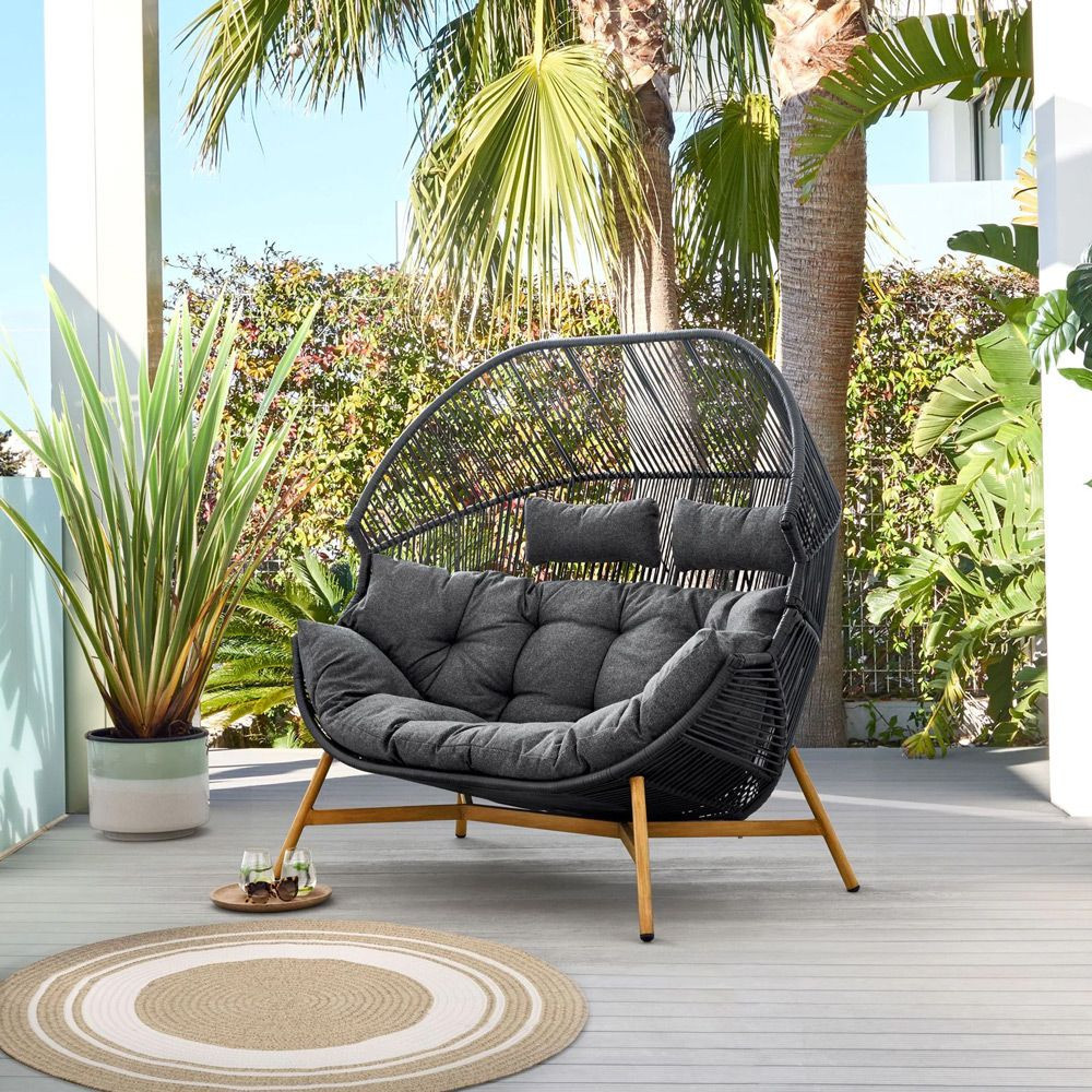 A két személy számára való kikapcsolódás most még szórakoztatóbb lehet a nagy, párnázott fotelnek köszönhetően . Az ergonómikus kosár bármilyen helyzetben való pihenéshez készült . Az egész szerkezetet egy puha párna egészíti ki, amely tovább növeli a pihenés kényelmét. A kétüléses fotel az aktuális trendeknek megfelelően eredeti dizájnjával tűnik ki. A fa színű lábakkal ellátott fekete kosár kombinációja nagyon modernnek tűnik. A fekete színű acél kerti fotel divatos belső terekbe ajánl különféle stílusokat .