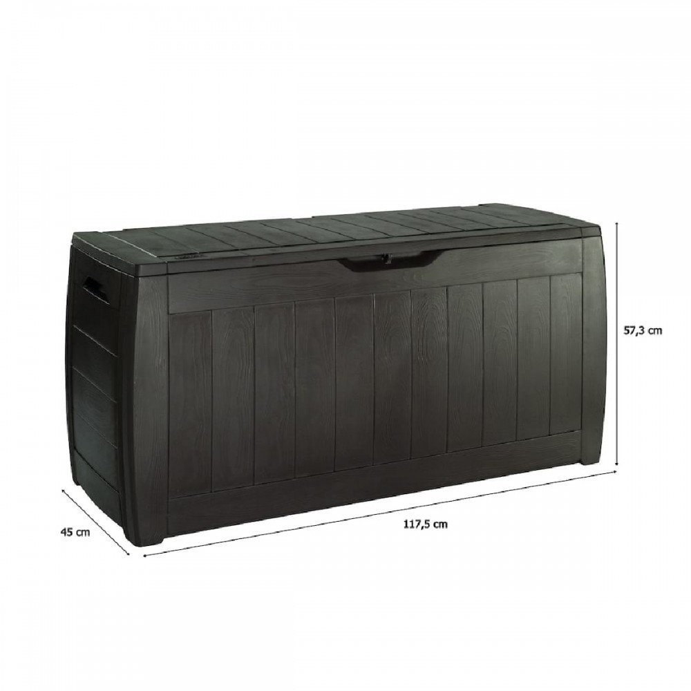 A funkcionális és tágas , 270 liter űrtartalmú kerti tárolót a neves Keter cég gyártotta, amelynek nagy tapasztalata van a műanyagból készült kerti felszerelések létrehozásában. A kerti tároló tökéletes hely a kerti székek, játékok vagy egyéb kerti felszerelések párnáinak tárolására. Noha fa kerti doboznak tűnik , ez csak egy stilisztikai eljárás, amelyet a gyártási folyamat során hajtanak végre. A Keter Hollywood Box teljes egészében erős és tartós műanyagból készül. Ennek köszönhetően vízálló, ellenáll az UV sugárzásnak és környezetbarát is. A Keter termékek előállításához szükséges anyagok nagy részét újrahasznosításból nyerik.