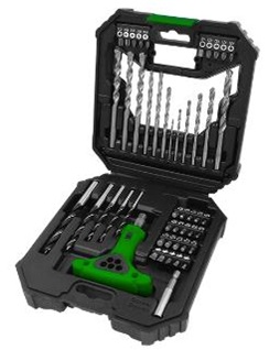 HSS-Fúró: (6 db) 2 / 3 / 4 / 5 / 6 / 8 mm Betonfúró: (6 db) 5 / 2x 6 / 2x 8 / 10 mm Fafúró: (5 kosov) 4 / 5 / 6 / 8 / 10 mm, Karbonstahl Csavarhúzó toldalékok 25 mm: (30 db) Laposfejű bit (SL): 3 / 4 / 5 / 6 / 7 Torx bit (T): 10 / 15 / 20 / 25 / 30 / 35 / 40 Imbusz bit (M): 3 / 4 / 5 / 5 / 6 / 6 Négyzet alakú bit (S): 1 / 2 / 2 / 3 Csillagfejű bit (PH): 0 / 1 / 2 / 3 Pozidriv bit (PZ): 0 / 1 / 2 / 3 Racsnis csavarhúzó markolat: (1 db) Mágneses toldószár: (1 db) Vízmérték: (1 db) • Csomagolás: Bőrönd • Bőrönd méret (mm): 191 (H) x 500 (SZ) x 175 (M) Külső doboz Külső doboz EAN kódja: 3830042566762 • Csomagolás mérete (mm): 365 (H) x 200 (SZ) x 215 (M) • Mennyiség: 8 db/doboz • Nettó súly: 8,0 kg • Bruttó súly: 8,5 kg