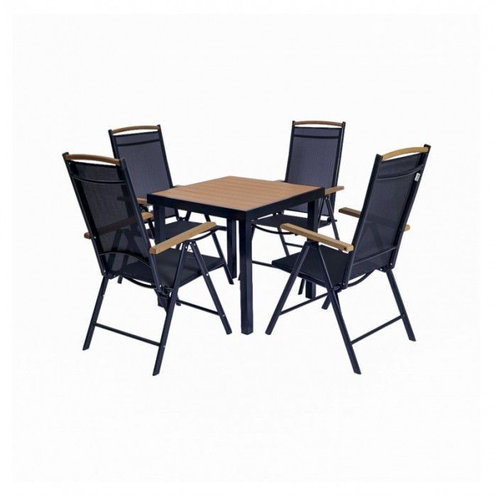 A készlet központi részét jelentő asztalt a könnyű, de strapabíró alumíniumból készült masszív felépítés jellemzi. Kerete stabilitást és tartósságot garantál. Az ebből az anyagból készült asztal további jellemzője a korrózióállóság, így tökéletes kültéri használatra. A készletben található székek szintén alumíniumból készültek. A fa színű karfák elegáns megjelenést kölcsönöznek nekik.