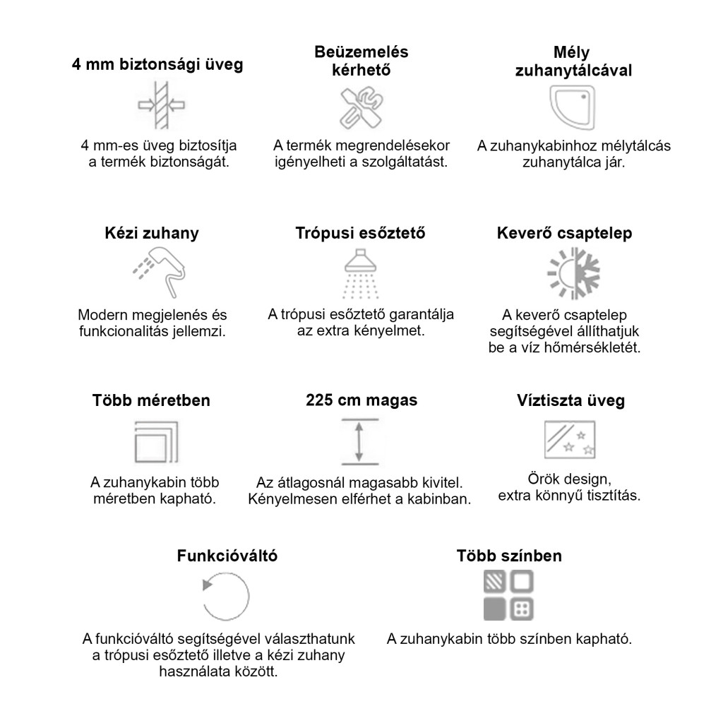 A kabin 225 x 80 x 80 cm, magasságából adódóan az átlagosnál nagyobb kényelmet nyújt, a mélytálca mérete 80 x 80 x 43 cm. A kialakítás sarokba telepíthető, így helytakarékos megoldást kínál. A termék alapfelszereltségéhez tartozik a kézi zuhany és a felső trópusi esőztető zuhanyfej, amelyek maximális kényelmet nyújtanak. Két méretben, 80 és 90 cm-es változatban kapható, így bármilyen fürdőszobához tökéletesen illeszkedik.