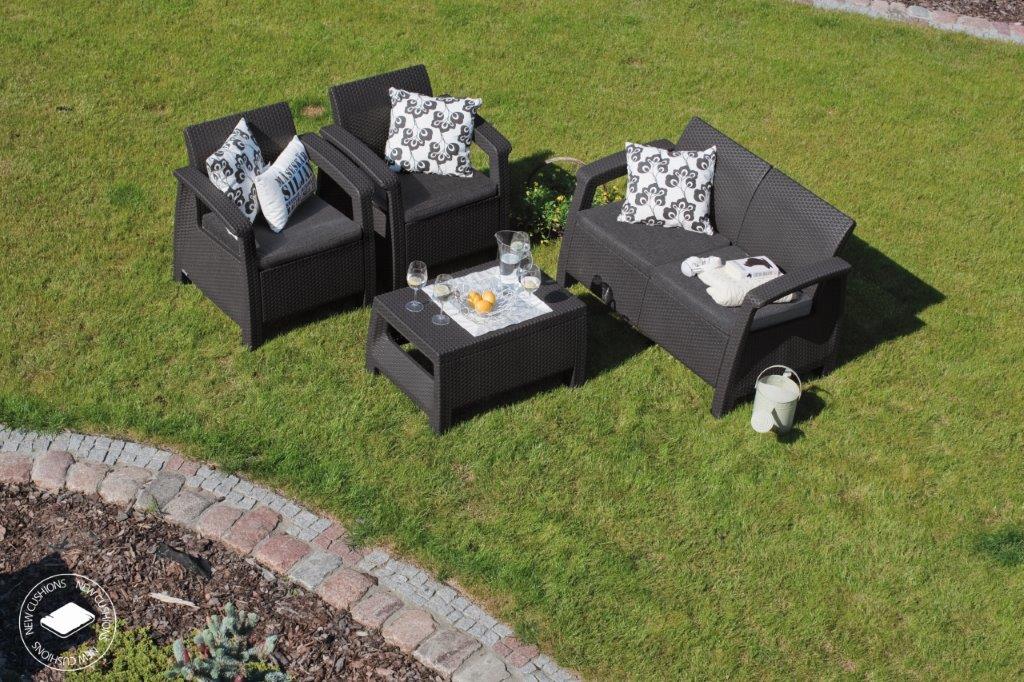 A Corfu kerti bútor szett a Keter termékcsaládjából természetes rattanra emlékeztet. Kiválóan kiegészíti a modern vagy a hagyományos stílusú környezetet. Élvezze a kényelmet a puha párnáknak köszönhetően.