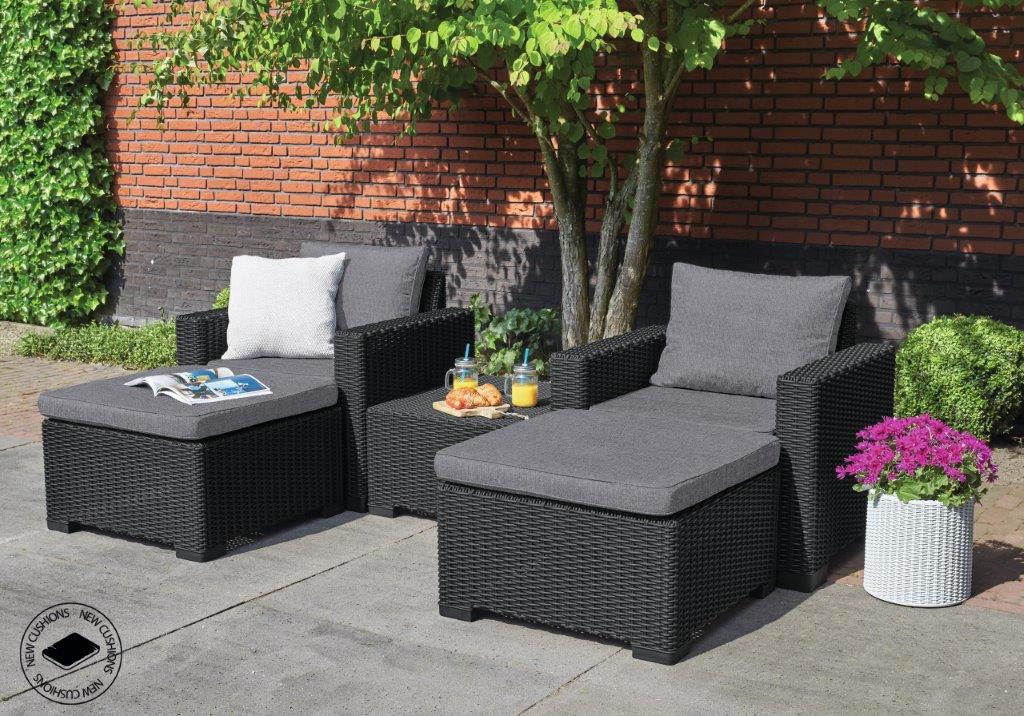 • A California Keter kerti szett tartalmaz egy fotelt, egy kárpitozott lábtartót és egy négyzet alakú asztalt