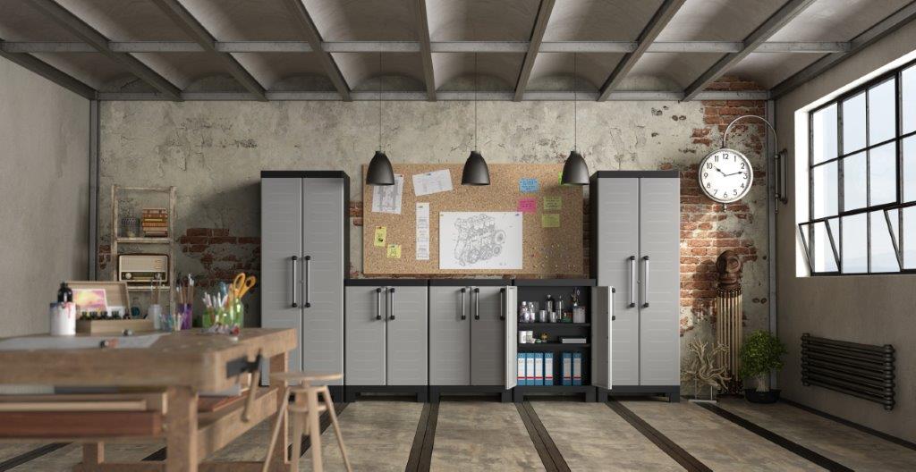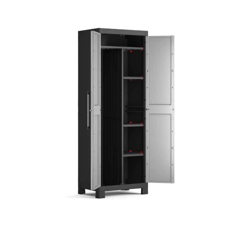 Karbantartásmentes szekrény garázsba, műhelybe vagy háztartásba, 1 felső és 3 alsó beszerelhető polc, 1 polc teherbírása 15/10 kg, lehetőség lezárásra, magas ellenállás az elhasználódásnak és az időjárásnak. PP gyanta. Szürke és fekete.