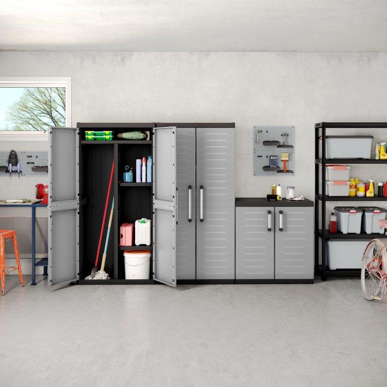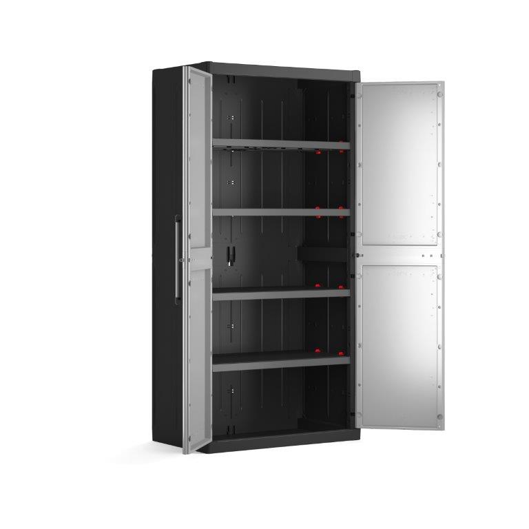 Karbantartásmentes szekrény sokoldalú felhasználásra garázsban, műhelyben és háztartásban, 4 polc egyszerű beszerelése, 1 polc teherbírása 25 kg, lehetőség lezárásra, magas ellenállás. Minőségi műanyag. Szürke.