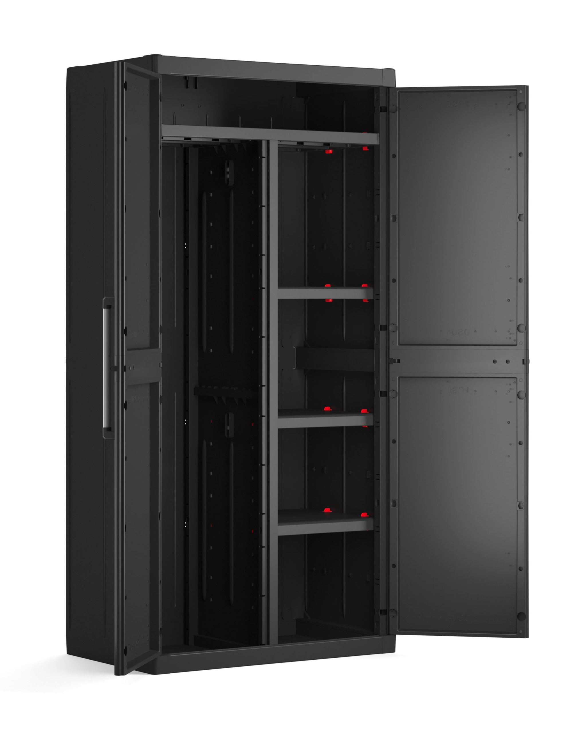 A szekrény 4 hozzáadott polccal rendelkezik – mindegyik 15 kg teherbírással, amelyek jól jönnek a nehezebb tárgyakra. Használhatószerszámok vagy kerti kellékek tárolására, jól jön hosszú nyelű szerszámokra, amelyek máshova nem férnének be. A neutrális fekete színének köszönhetően beleillik minden térbe függetlenül a berendezés stílusától.