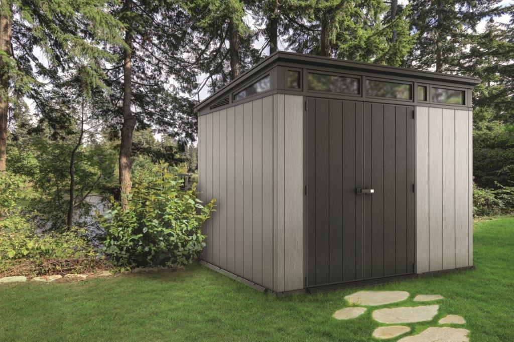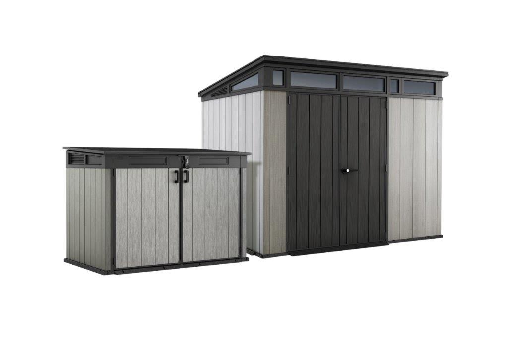 A szett másik eleme a Grande Store tárolódoboz, amely 2020 literes kapacitásával ideális nagyméretű tárgyak – például kukák, grillezők vagy hosszú szerszámok – tárolására. A lejtős küszöb megkönnyíti a nehéz tárgyak be- és kipakolását. A rozsdamentes acél zsanérok, megerősített falak és vízálló padló időjárásállóságot biztosítanak.