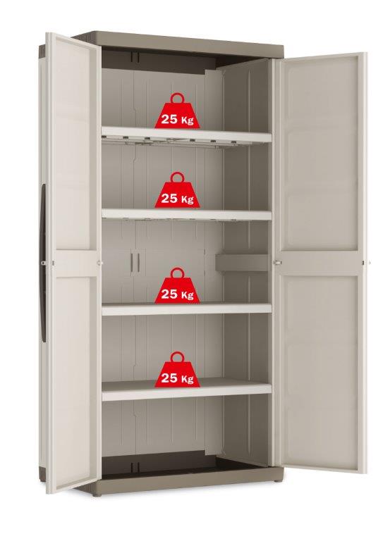 A szekrény 4 hozzáadott polccal rendelkezik – mindegyik 25 kg teherbírással, amelyek jól jönnek különböző nehéz tárgyakra. Használható szerszámok vagy kerti kellékek tárolására, jól jön hosszú nyelű szerszámok tárolására, amelyek máshova nem férnének be. Az univerzális bézs színének köszönhetően minden helységbe illeni fog függetlenül a berendezés stílusától.