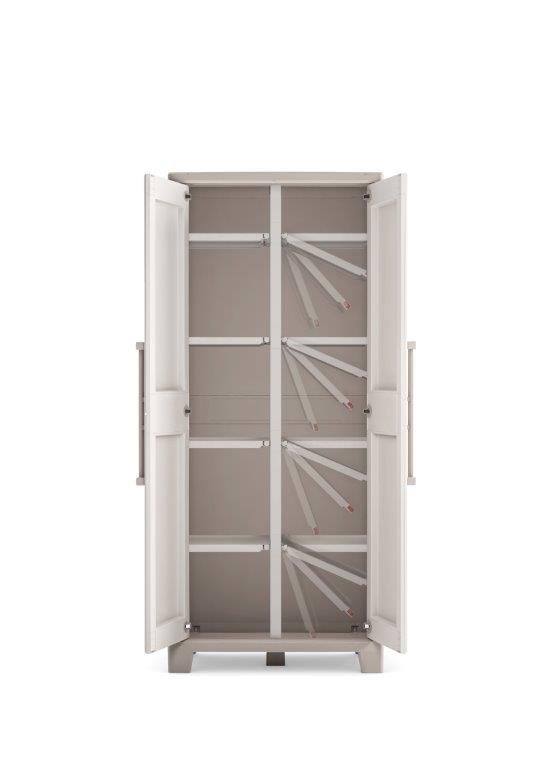 A lehajtható polcoknak köszönhetően a Gulliver Utility szekrényben akár seprűket, rudakat, szerszámokat vagy palackokat is könnyedén tárolhat. Egy-egy szint 30 kg terhelést is kibír, így nehezebb eszközökhöz is tökéletes. A belső elrendezés az igényekhez igazítható.