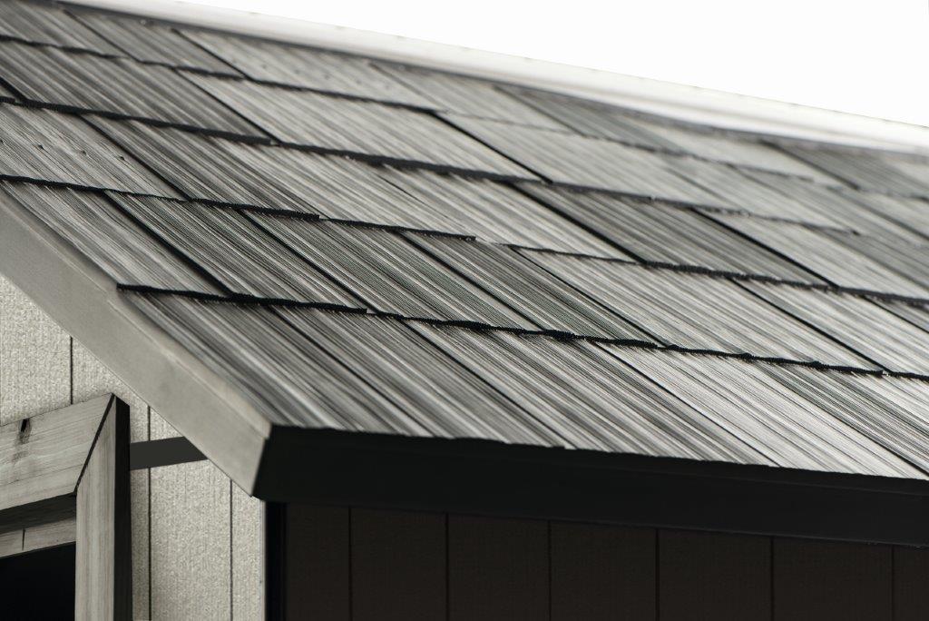 Kerti tároló kerti és műhelyi szerszámok, és egyéb felszerelés tárolására, 2,29 x 2,42 x 2,87 m, a nyeregtető 100 kg/m2 teherbírással rendelkezik. Dupla falak, dupla ablakok. Duotech kompozit, polipropilén. Szürke és antracit szín.