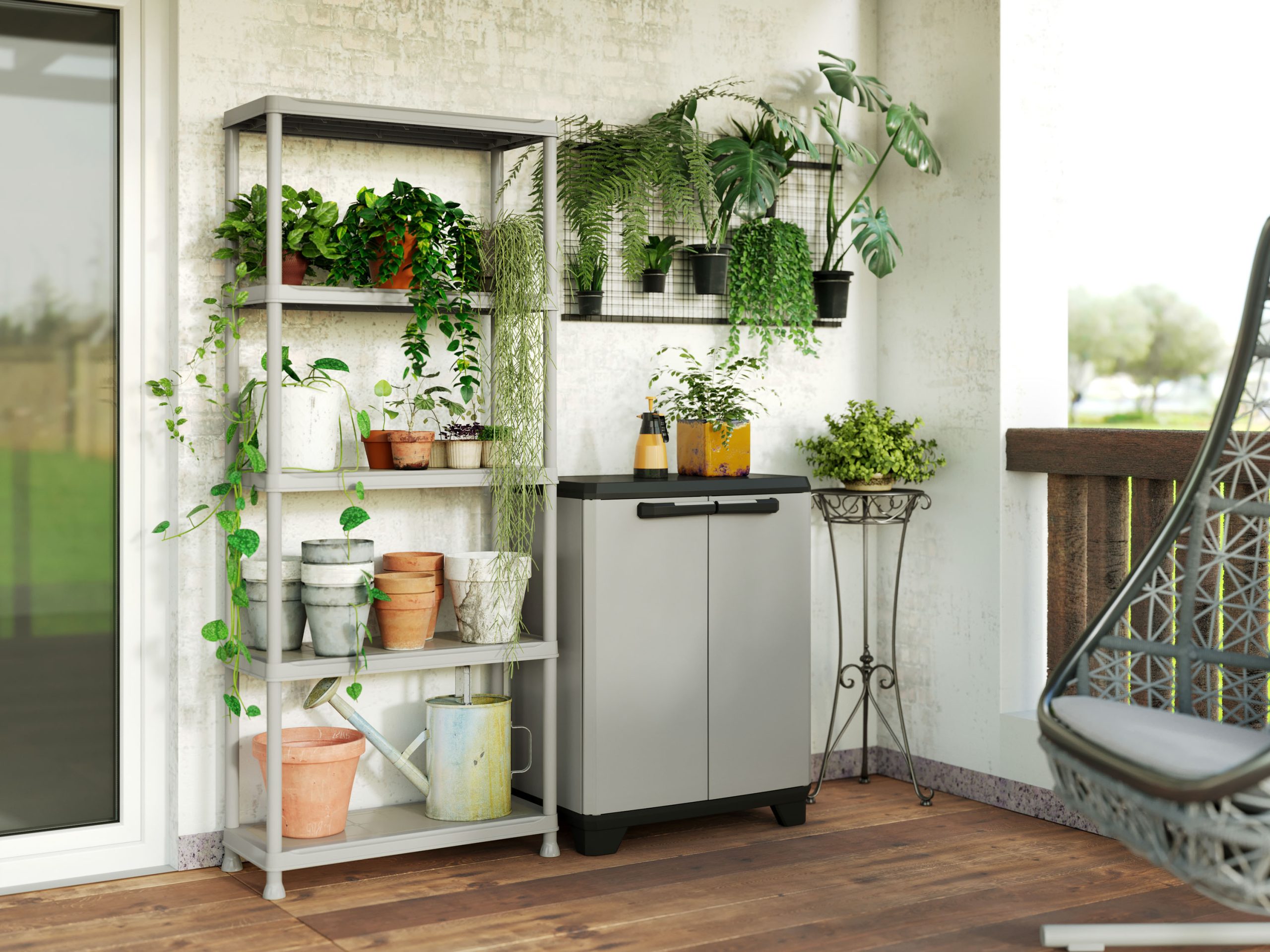 - Megfelel kerti kellékek és virágtartók tárolására és virágok kiállítására