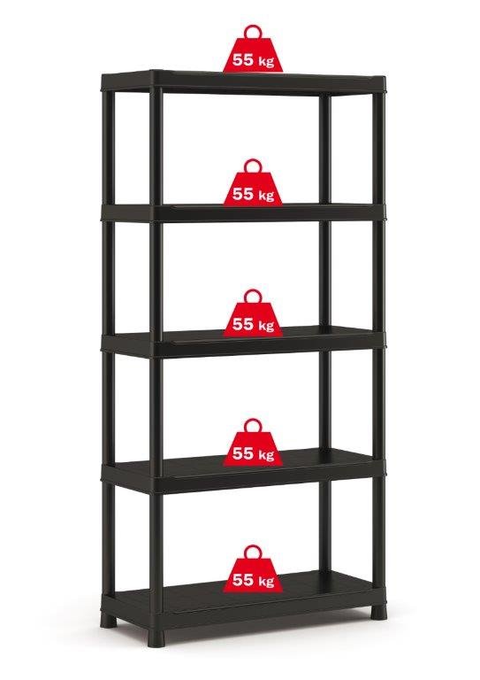 Az állvány 5 polcot tartalmaz extrém teherbírással, amelyek nehezebb tárgyakat is elbírnak. Használható szerszámok és kerti kellékek tárolására, mivel jól jön olyan szerszámok tárolására, amelyek máshol nem férnének el. Az állvány rögzíthető a falhoz a nagyobb stabilitásért. Az univerzális fekete színének köszönhetően minden helységet kiegészít.