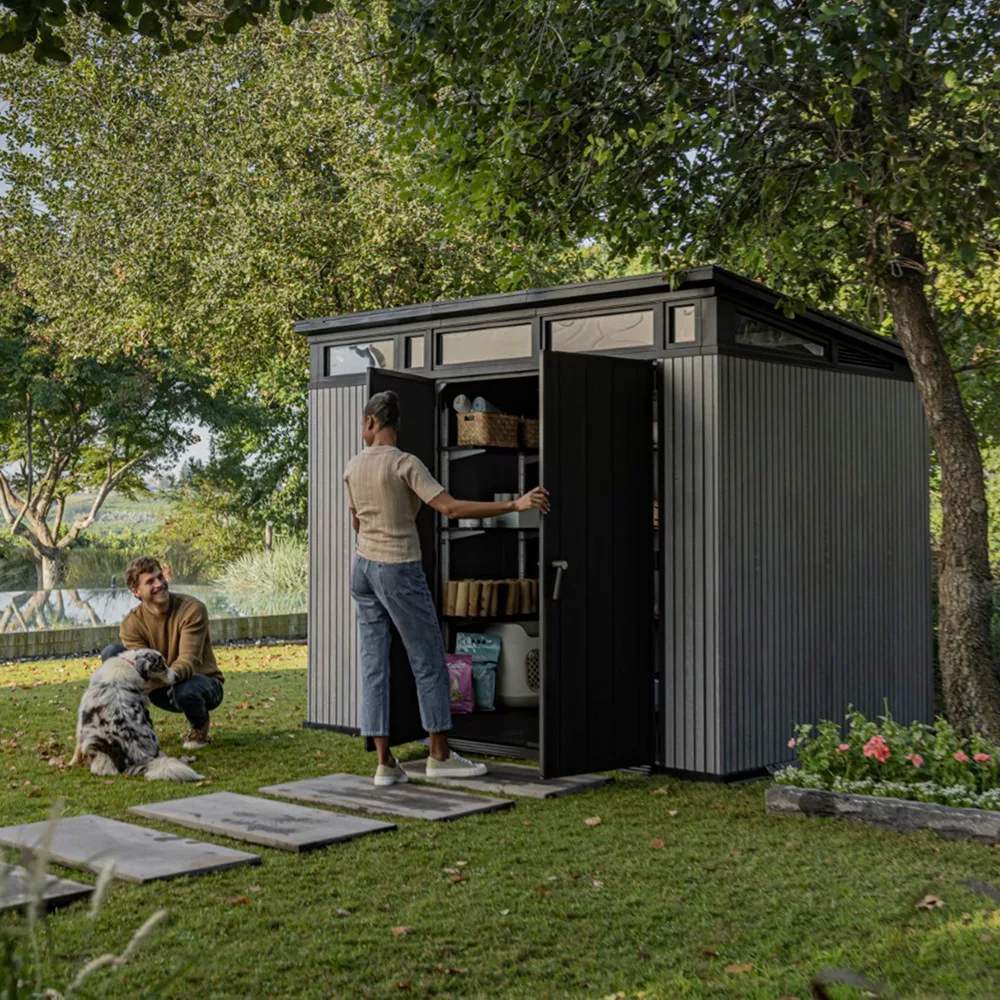 - Modern dizájn – A letisztult ferde tető és a stílusos fekete ajtók bármilyen kertbe illenek.