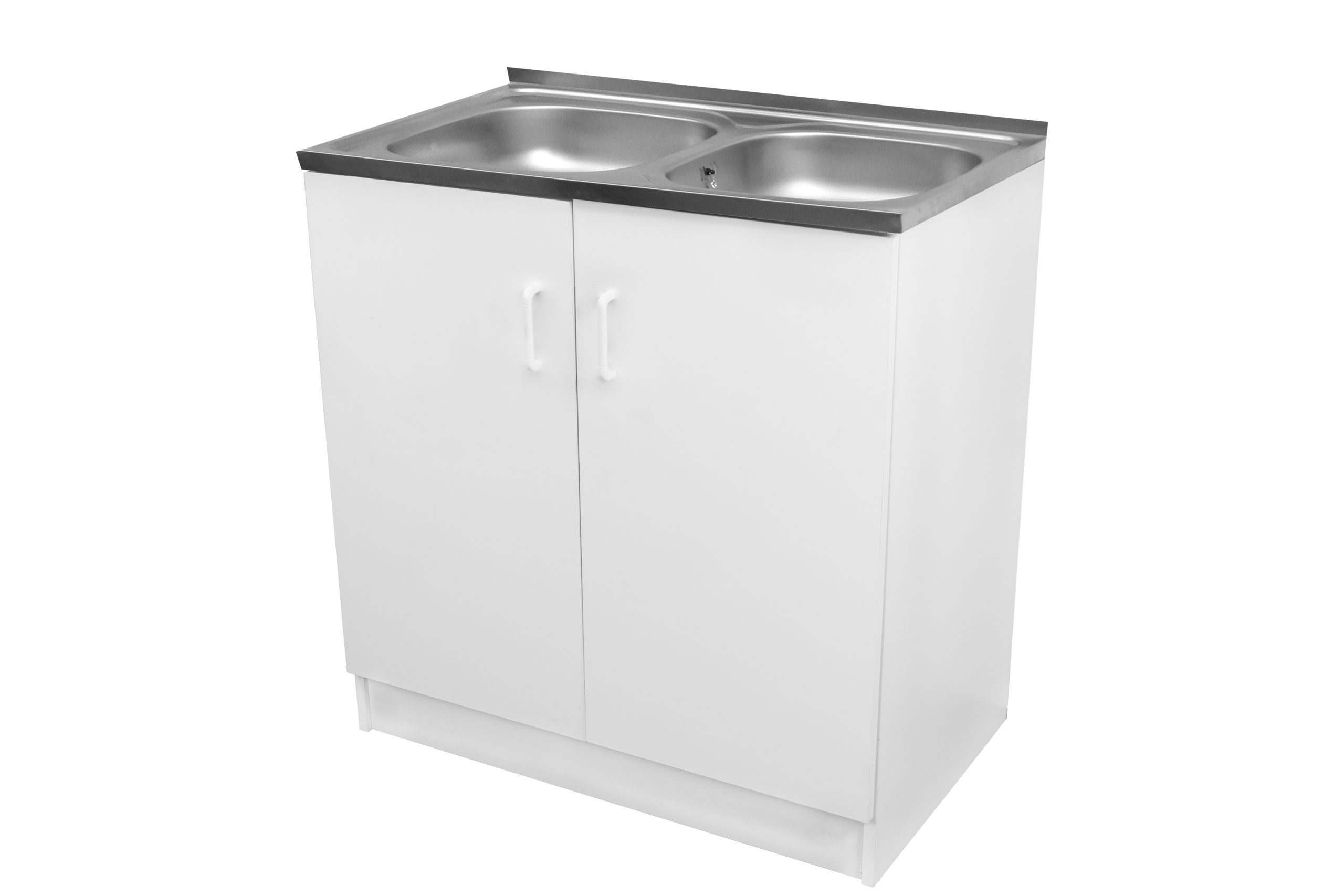 Mosogatós alsószekrény fehér korpusz, fehér front, nyílóajtós, kétmedencés mosogatótállal. Méretek: (mé x szé x ma): 50 x 80 x 83 cm