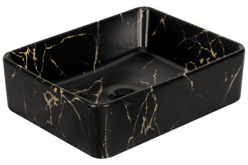 KR-182 kerámia design mosdó fekete-arany márvány mintával Műszaki adatok: Szín: fekete-arany márvány mintával Forma: téglalap alakú Méretek: magasság 13 cm, szélesség 47,5 cm, mélység 36,5 cm