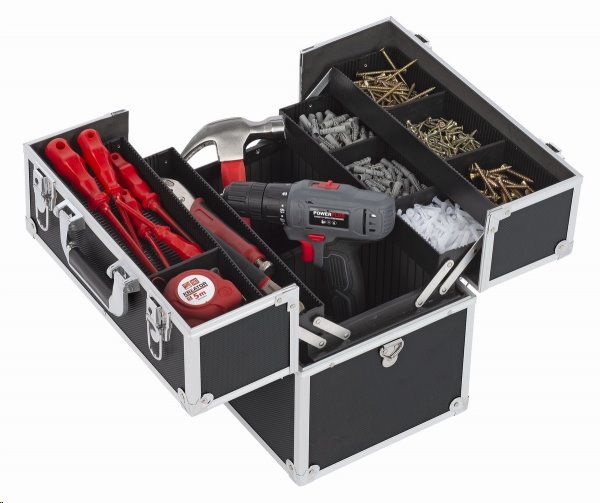 A fekete-ezüst színű kinyitható alumínium Kreator szerszámos láda mérete 360 x 230 x 300 mm. Lezárható (2 x kulcs a csomagban) és áthelyezhető (beépített fogantyú és állítható pánt). A belseje párnázott állítható rekesszel és rendszerezőkkel.