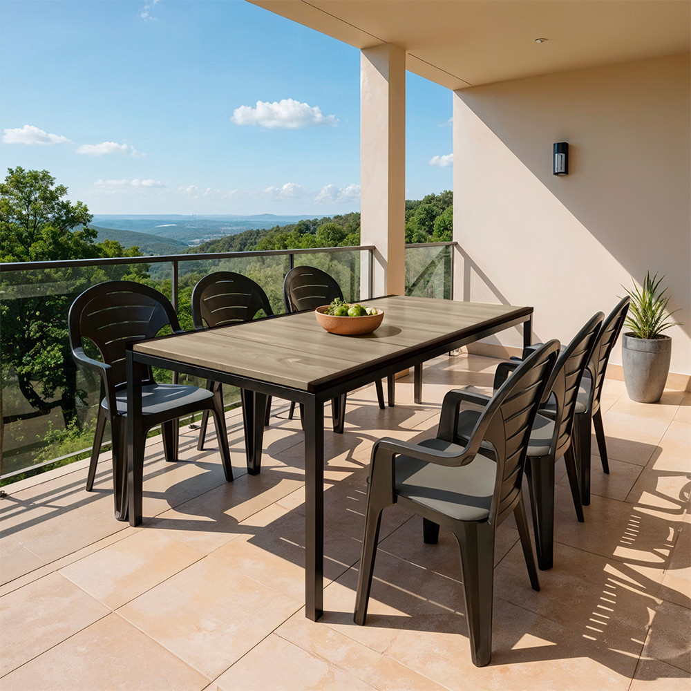 Egyetlen, nagyméretű szettben mindent megkapsz, ami a hétköznapi reggelitől a baráti grillpartiig kell: hat Bonaire rakásolható karfás szék + egy 200 × 95 cm-es Porto étkezőasztal – prémium műanyagból, kompromisszumok nélküli kényelemmel és nulla karbantartással.