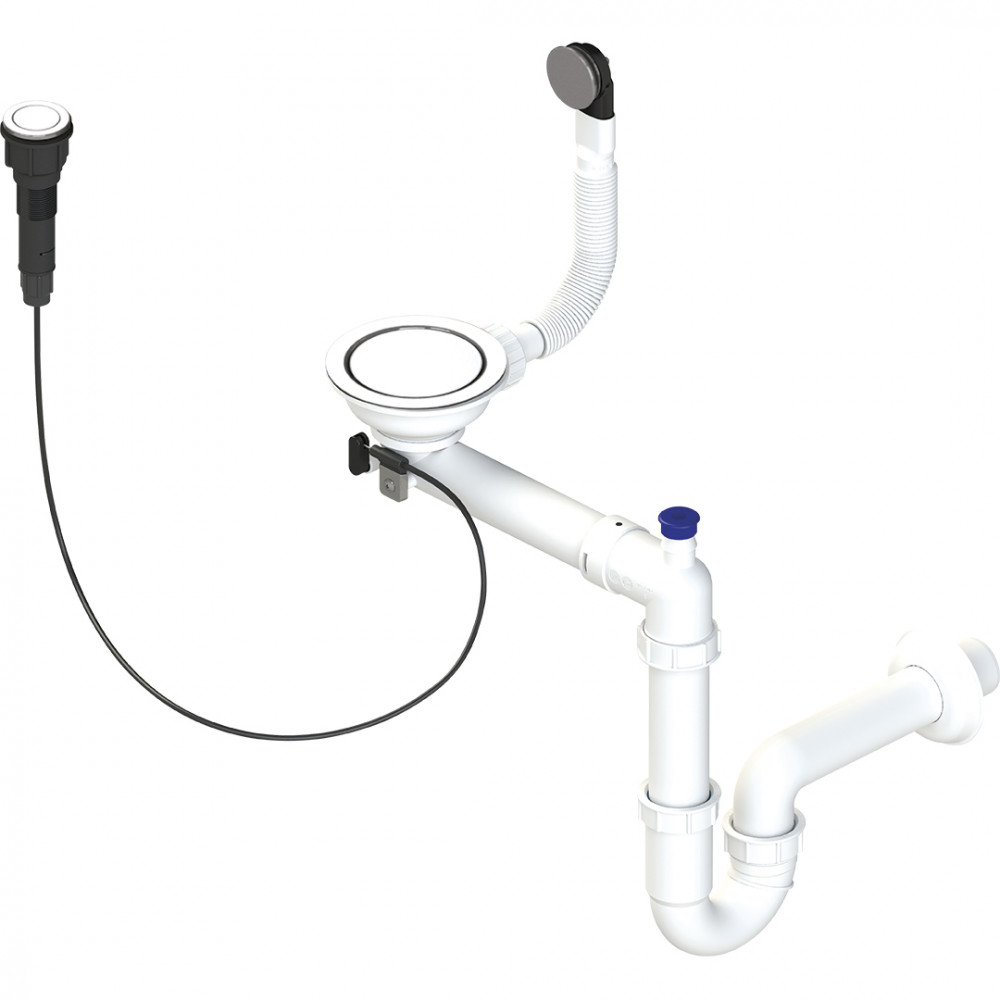 Laveo helytakarékos szifon pneumatikus vezérlésű távműködtető dugókeiemlővel, 3,5″-os kosárral, kerek túlfolyóval, mosogatógép csatlakozóval.
