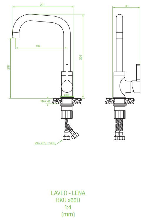 Ez a modell egy mozgatható, L alakú kifolyóval rendelkezik, amelynek hossza 184 mm, így kényelmesen mosogathat és tölthet nagyobb edényeket is. A 302 mm-es teljes magassága könnyű használatot biztosít, még nagyobb edények esetén is.