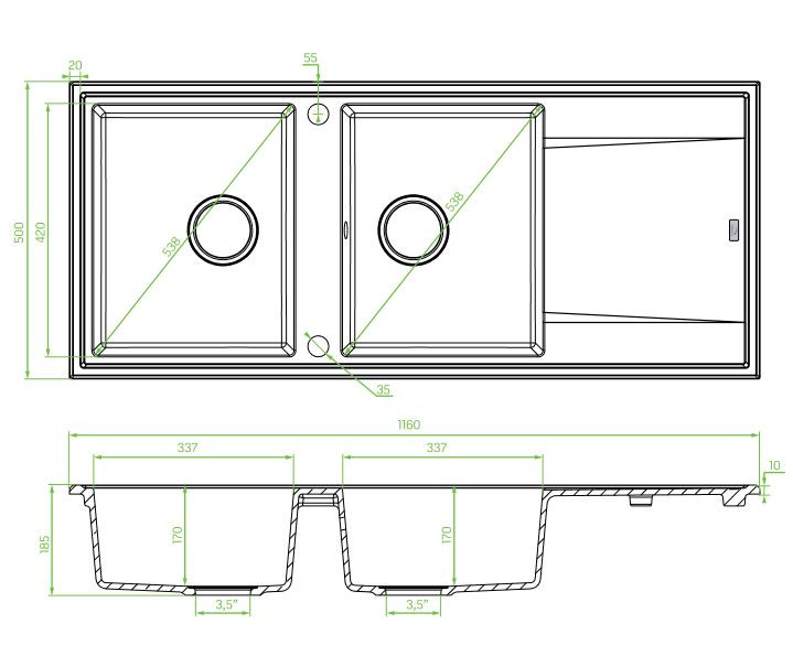 Laveo MEGALO kétmedence csepptálcás szemcsés fekete mosogató dugókiemelős helytakarékos szifonnal – SRE_721T