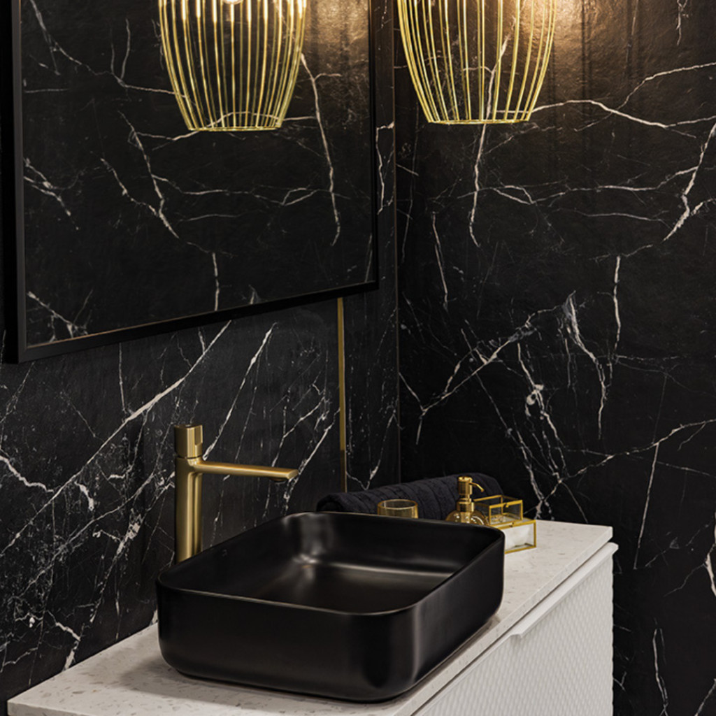 A Mogami pultra szerelhető mosdó egy matt fekete mosdó, amelyet modern stílusú fürdőszobákba terveztek. A matt fekete felület a fekete szerelvényekkel kombinálva valóban egyedi karaktert kölcsönöz a helyiségnek. A lekerekített sarkok lehetővé teszik a szennyeződések könnyű eltávolítását. Az elegáns Mogami mosdók bármilyen formájú és színű, magas pultra szerelhető csaptelephez illenek, egyedi kombinációt alkotva.