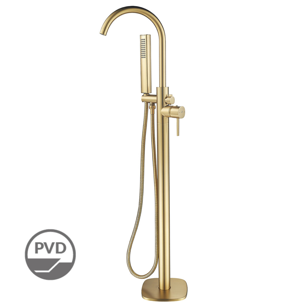 A szálcsiszolt arany felületű, szabadon álló Pola kádcsaptelep tökéletesen mutat elegáns, minimalista, modern stílusú fürdőszobákban. Ez a modell a teljes kollekcióra jellemző karcsú karral és lekerekített, U alakú kifolyóval rendelkezik a könnyű víztöltés érdekében. A csaptelephez mellékelt zuhanyszett tartalmaz egy csavarodásgátló tömlőt és egy kézi zuhanyt.