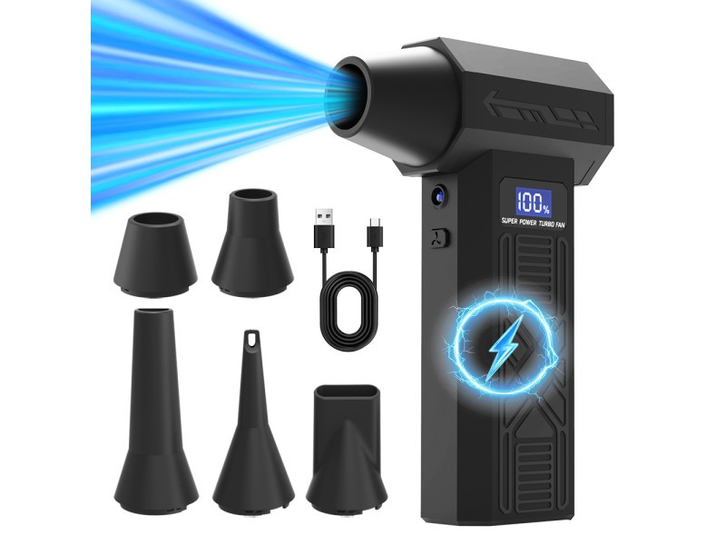 Vezeték nélküli mini turbó fúvóka sokféle otthoni és munkahelyi felhasználásra. Kézreálló, turbóventilátorral hajtva, amely akár 120000 fordulat/perc sebességre gyorsul fel a legmagasabb fokozaton. Az előállított légáram akár 180 gramm súlyú konyhai mérleget is megterheli.