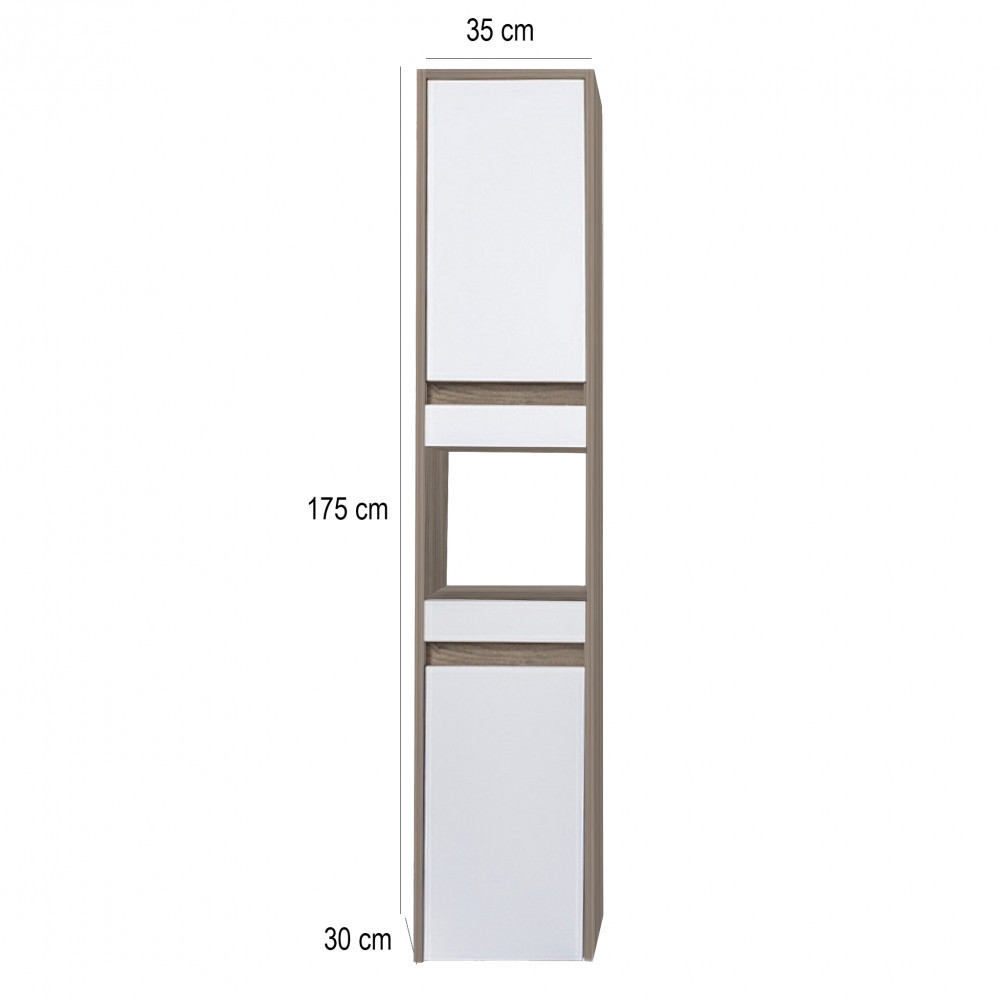 A fürdőszoba bútor tágas pakoló résszel rendelkezik ahol kényelmesen elférnek a fürdőszobai pipere eszközök. Kompakt kialakítása miatt kisebb fürdőszobák berendezésére is alkalmas, például panel lakásokban. A termék magas minőségű bútorlapból készül és színben passzoló élzárókkal van ellátva. A fürdőszoba bútor felfüggesztett és álló kivitelben is kapható.